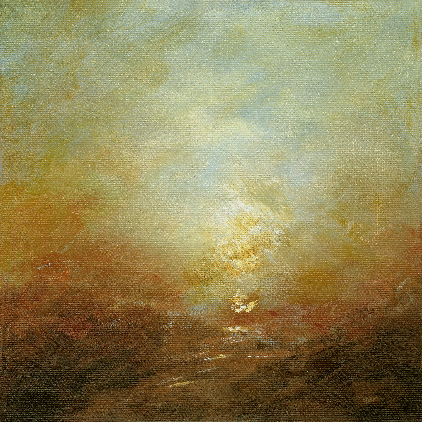 Alchimie 25 est la concrétisation d'une forte envie de peindre un paysage ancien dans un style dérivé de celui de Turner mais en y apportant une touche abstraite dans le sujet. Le choix du petit format s'est vite imposé de lui-même en regard des contraintes techniques liées à l' acrylique. Je voulais en effet peindre à la fois et dans un même temps avec 2 techniques opposées, celle du fondu et celle du glacis. La première consistant à mélanger les couleurs sur la toile et la seconde a les superposer par transparence. L’acrylique séchant beaucoup trop vite pour la conserver humide sur toute la surface, il fallait que celle-ci soit assez petite pour me laisser le temps de mélanger les couleurs à chaque endroit de la toile. J' ai pu de ce fait conserver une vision globale de la composition me permettant de m'affranchir de toute retouche.