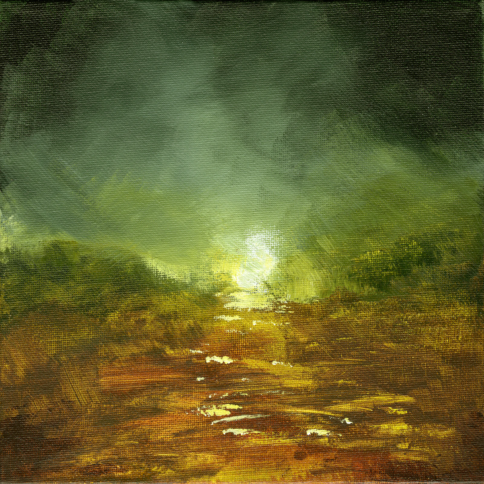 Alchimie 28 est la concrétisation d'une forte envie de peindre un paysage ancien dans un style dérivé de celui de Turner mais en y apportant une touche abstraite dans le sujet. Le choix du petit format s'est vite imposé de lui-même en regard des contraintes techniques liées à l' acrylique. Je voulais en effet peindre à la fois et dans un même temps avec 2 techniques opposées, celle du fondu et celle du glacis. La première consistant à mélanger les couleurs sur la toile et la seconde a les superposer par transparence. L’acrylique séchant beaucoup trop vite pour la conserver humide sur toute la surface, il fallait que celle-ci soit assez petite pour me laisser le temps de mélanger les couleurs à chaque endroit de la toile. J' ai pu de ce fait conserver une vision globale de la composition me permettant de m'affranchir de toute retouche.
