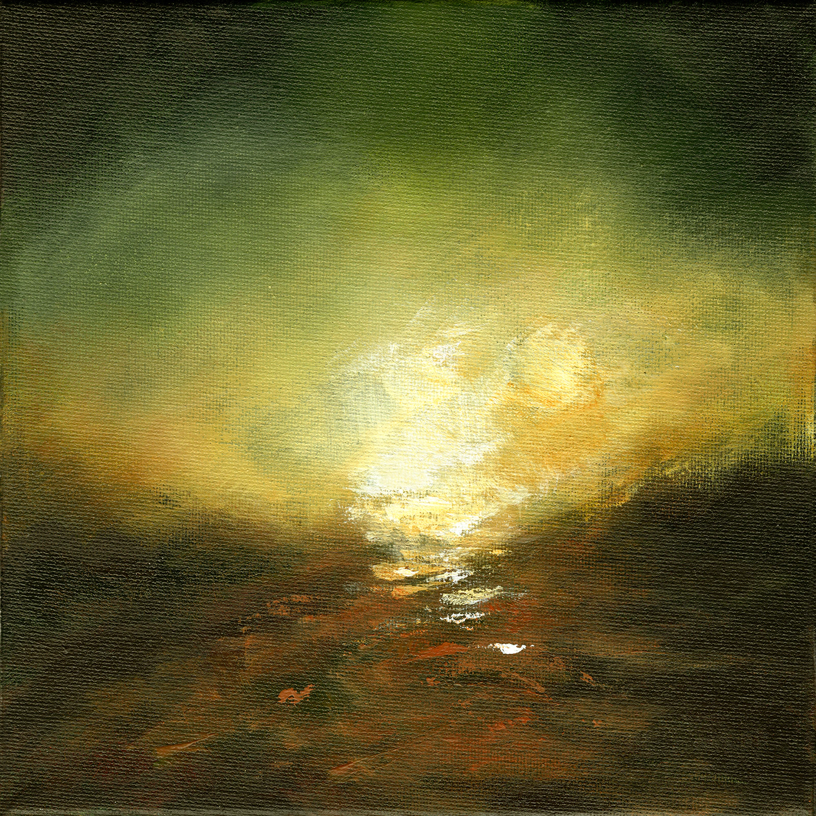 Alchimie 31 est la concrétisation d'une forte envie de peindre un paysage ancien dans un style dérivé de celui de Turner mais en y apportant une touche abstraite dans le sujet. Le choix du petit format s'est vite imposé de lui-même en regard des contraintes techniques liées à l' acrylique. Je voulais en effet peindre à la fois et dans un même temps avec 2 techniques opposées, celle du fondu et celle du glacis. La première consistant à mélanger les couleurs sur la toile et la seconde a les superposer par transparence. L’acrylique séchant beaucoup trop vite pour la conserver humide sur toute la surface, il fallait que celle-ci soit assez petite pour me laisser le temps de mélanger les couleurs à chaque endroit de la toile. J' ai pu de ce fait conserver une vision globale de la composition me permettant de m'affranchir de toute retouche.