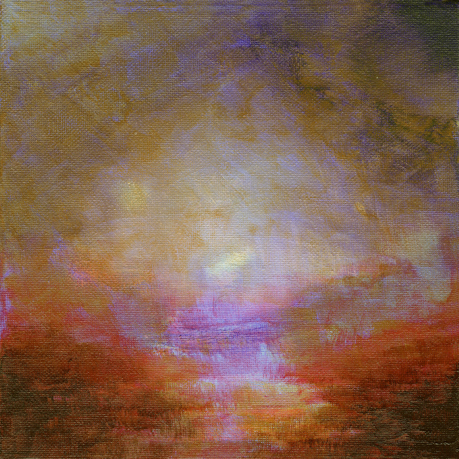 Alchimie 32 est la concrétisation d'une forte envie de peindre un paysage ancien dans un style dérivé de celui de Turner mais en y apportant une touche abstraite dans le sujet. Le choix du petit format s'est vite imposé de lui-même en regard des contraintes techniques liées à l' acrylique. Je voulais en effet peindre à la fois et dans un même temps avec 2 techniques opposées, celle du fondu et celle du glacis. La première consistant à mélanger les couleurs sur la toile et la seconde a les superposer par transparence. L’acrylique séchant beaucoup trop vite pour la conserver humide sur toute la surface, il fallait que celle-ci soit assez petite pour me laisser le temps de mélanger les couleurs à chaque endroit de la toile. J' ai pu de ce fait conserver une vision globale de la composition me permettant de m'affranchir de toute retouche.