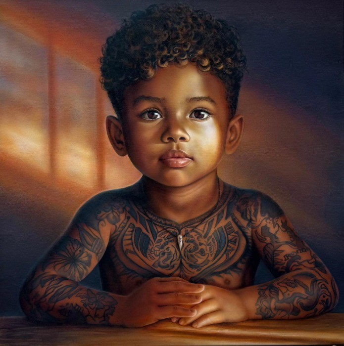 Daria Danova, originaire de Kiev, est une artiste ukrainienne aujourd’hui établie en France. Depuis son plus jeune âge, elle s’intéresse à la nature et à ses structures organiques, qu’elle aime traduire en formes visuelles puissantes. En Ukraine, elle s’impose comme l’une des pionnières de l’art abstrait à base de résine époxy, développant un style très personnel et organisant des ateliers réguliers dans son propre studio. Ses œuvres s’inspirent alors des vagues, des géodes et d’autres motifs naturels qui évoquent à la fois la force, l’énergie et la sérénité. La guerre marque un tournant brutal : contrainte de quitter son pays, Daria perd son atelier et tout ce qu’elle avait construit artistiquement. Son arrivée en France ouvre cependant une nouvelle étape de sa trajectoire. Elle se tourne vers la peinture acrylique et l’aérographe, des techniques qui lui permettent d’atteindre un niveau de précision, de douceur et de contrôle qui redéfinissent son langage visuel. Aujourd’hui installée en région parisienne, elle évolue vers une peinture figurative centrée sur la lumière, les textures et l’émotion. Elle crée une série dédiée à l’enfance, un thème profondément lié à l’histoire récente de l’Ukraine. Elle oppose des visages angéliques à des éléments et attitudes d’adultes — pistolets, tatouages, vêtements ou postures trop mûrs — révélant ainsi la réalité d’une enfance volée, bouleversée par la guerre et la nécessité de grandir trop vite.