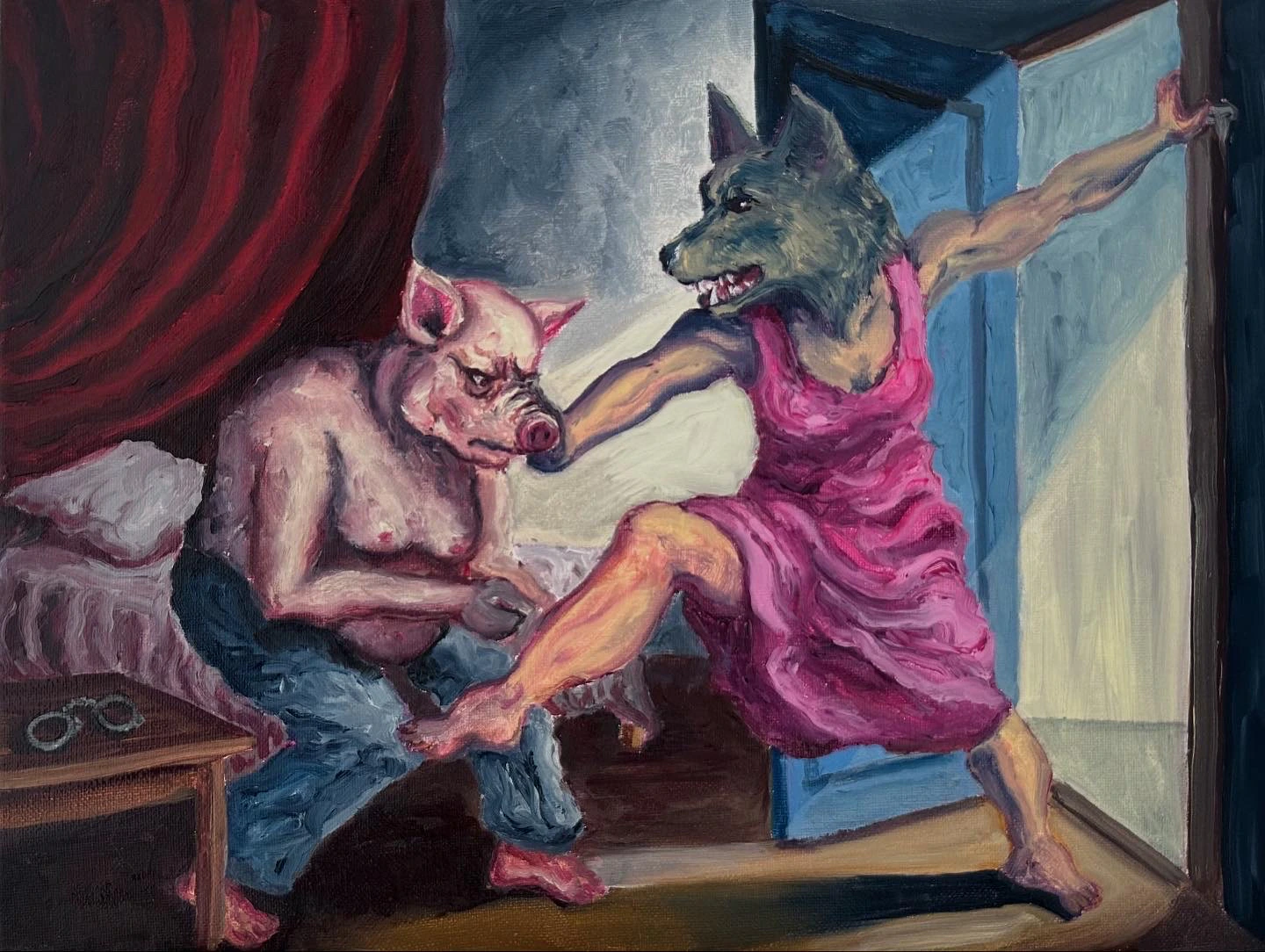 Mon travail questionne la frontière entre l’humain et l’animal, entre le quotidien et l’apocalypse silencieuse du climat. Chaque peinture est un cri coloré, une tentative de saisir ce moment d’équilibre instable où tout peut basculer.