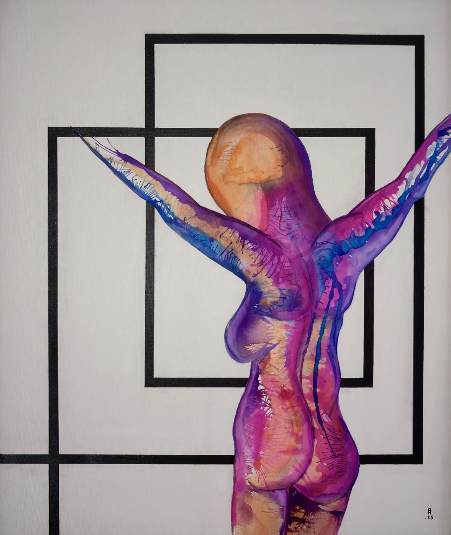 Autodidacte ayant débuté par l’écriture, j’ai développé au départ l’aspect graphique pour présenter le texte avant que ce dernier ne prenne le pas sur les mots. Mon travail est principalement une recherche autour de l’humain et plus particulièrement de la représentation de l’être dans le regard d’autrui. La dualité entre la reconnaissance et la connaissance de l’autre et de soi-même. L’absence de visage et la transparence des silhouettes sont pour moi le moyen de faire entrer le spectateur dans ces dernières et de se les approprier. J’aime laisser le champ libre à chacun de s’en raconter l’histoire, d’y projeter ses envies, ses rêves, ses peurs, ses révoltes… J’apprécie de varier les supports, cartons entoilés, plexiglass, béton ainsi que les médiums bombe, peinture, posca, collages … Mes influences sont multiples de Francis Bacon aux surréalistes en passant par le mouvement Dada et le Street-art. Je défends l’idée que l’art peut être aussi sacré qu’insignifiant mais qu’il n’en reste pas moins vital et essentiel à chacun.