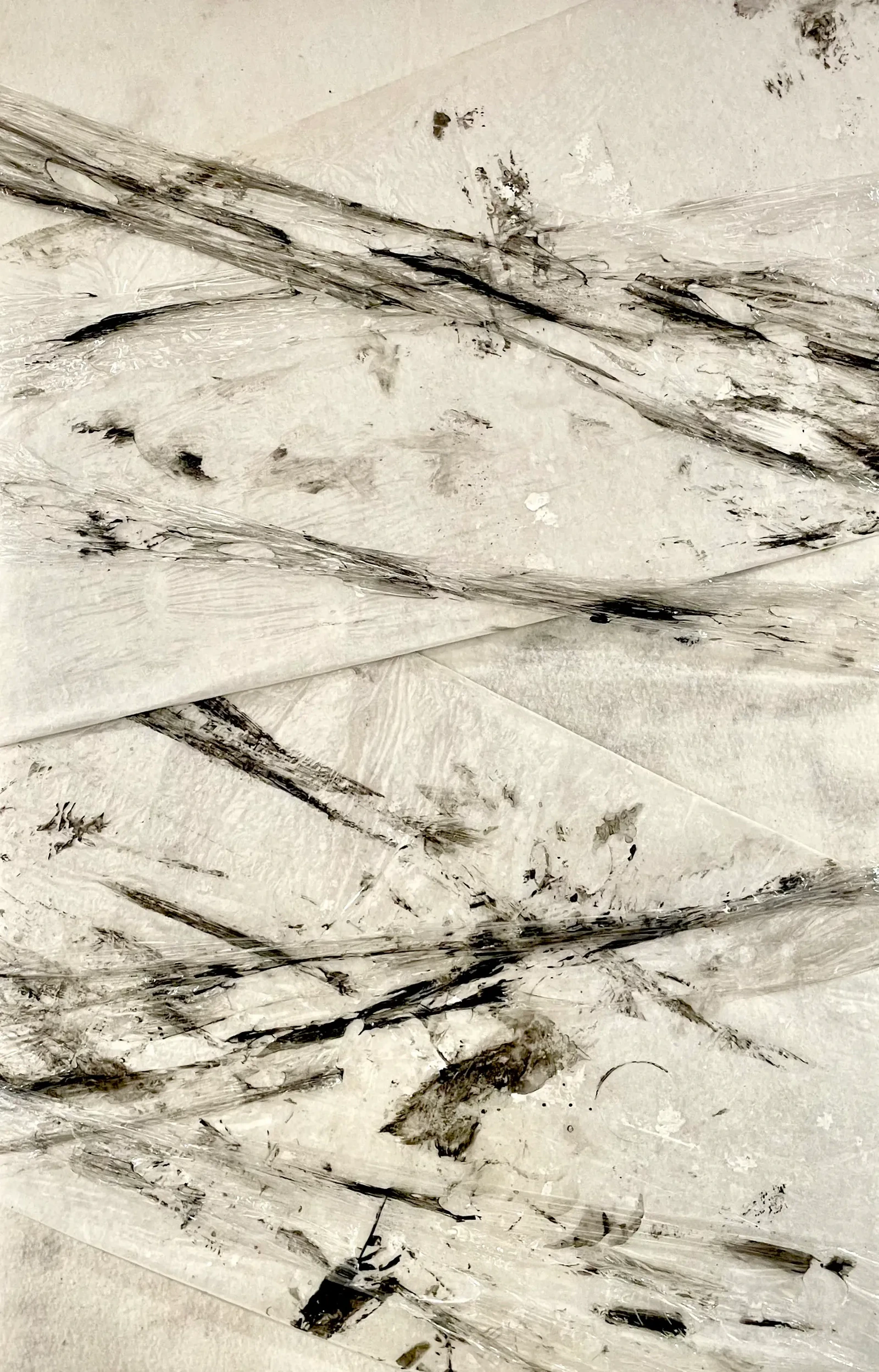 Asphyxie 013 se place à la fin de la série. Le cellophane perd peu à peu son emprise sur le support. Il se raréfie et laisse à présent respirer la toile. Derrière toute cette épaisseur noircie qui laissait apparaître des jeux de transparence et d’opacité, on découvre une blancheur nouvelle. Le processus de renaissance s’est accomplit, une échappatoire prend forme derrière la lumière apportée par la blancheur du fond, comme une ultime rédemption. Il s’agit de la fin du cheminement inauguré par Asphyxie 001. La série, se terminant par le chiffre 13 avec cette dernière Asphyxie appuie sur les dimensions hasardeuses de ce nombre. En effet, tout à la fois porteur de chance et de bonheur, souvent maudit et redouté, il doit nous amener ici à la rupture d’un cycle pour l’avènement de quelque chose de nouveau. Aussi, les dernières traces noires qui la parcheminent sont des résidus, des séquelles qui cicatrisent. Puisque jamais rien ne disparaît réellement, l’œuvre ici nous prouve que nous devons panser nos stigmates.
