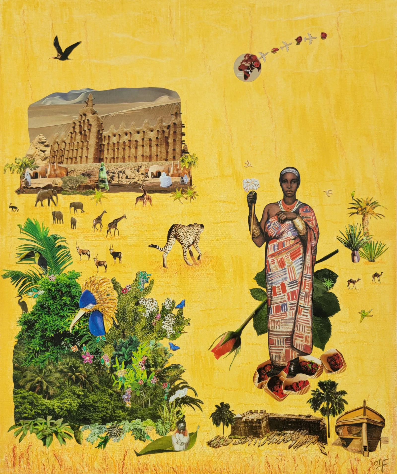 Au nom de la rose est une composition de collage papiers sur un fond en pastels secs réalisé sur un carton entoilé de coton. Cette oeuvre incite à réfléchir sur le sujet de la culture intensive de la rose sur le continent africain. cela apporte certes, une aide à l'économie des pays concernés mais une perturbation pour l'environnement et l'écologie de ce continent. Quels sont les choix réellement utiles pour le bien de tous à long termes ? Telle est la question que je pose ici avec cette composition.