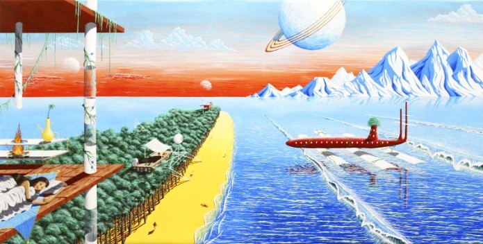 " Architecte de formation, Camille Adra est un peintre français travaillant aussi bien sur toiles qu'en milieu urbain. Ce dernier est nettement influencé par des artistes tels que Keith Haring, Albert Dubout, Hervé Di Rosa, Robert Combas ou encore Moebius. Ses premiers travaux mettent ainsi en avant des personnages joyeux, humoristiques ou satiriques, tandis que les plus récents évoluent vers des scènes et paysages surréalistes. Camille Adra a multiplié les expositions en France, notamment à Paris, Bordeaux, Lyon ou encore Montpellier, mais aussi à l'étranger, en Russie, aux Pays-Bas, au Liban et au Kazakhstan. " Texte de Hadrien Caupenne