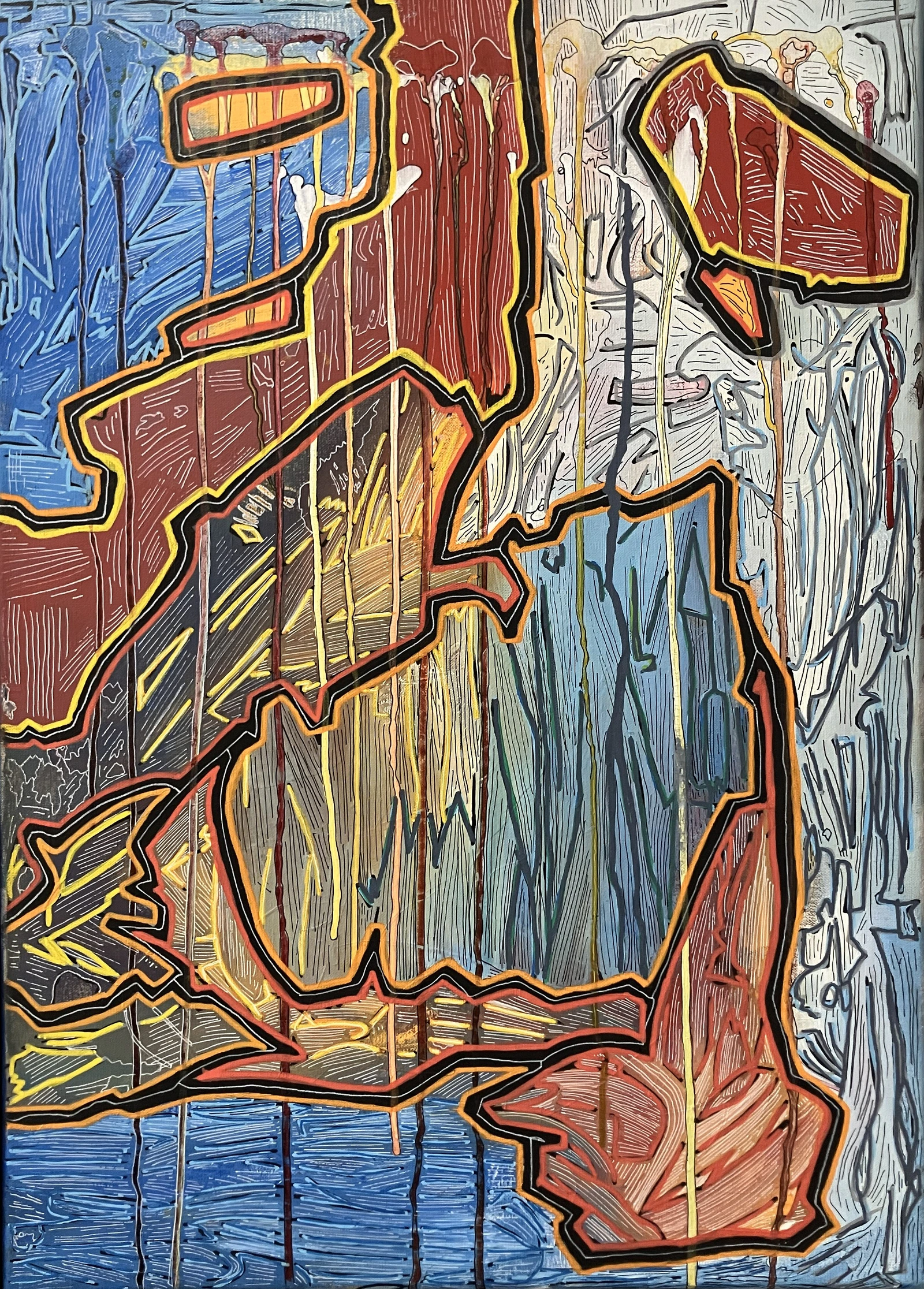 Interpretation abstraite d'une averse. Le fond est réalisé à la peinture acrylique, traversé par des coulures, et ensuite des trames au marqueur acrylique afin d'apporter une dimension plus graphique à l'œuvre.