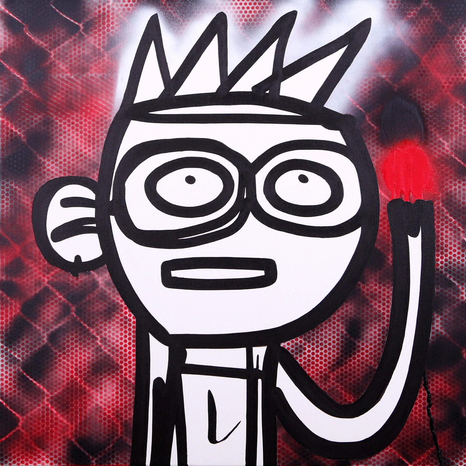 Portrait brut et instinctif de "BASQUIEN", mon identité visuelle. Œuvre issue d'une série de portrait dans lesquels la structure du tableau avec le personnage central est toujours réalisée à la peinture acrylique mais chaque fond est réalisé avec une technique différente, dans le cas présent à la bombe. BASQUIEN RAW 60 x 60 cm Peinture acrylique, Bombe de peinture Année : 2025 1/1 Toile en coton montée sur châssis bois 3D Encadré avec une caisse américaine en escalier noire Signé sur le bord droit et contresigné au dos Livré avec certificat d'authenticité
