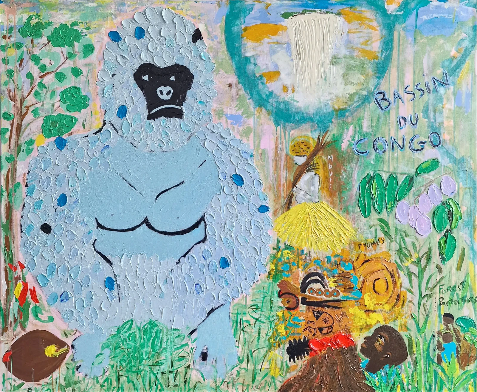 No6 de la Serie "Social Networks" Un gorille bleu monumental et un enfant pygmée se rencontrent au coeur du Bassin du Congo. L'oeuvre explore le lien entre nature, humanité et climat, faisant du Congo un symbole de la fragilité et de la puissance du vivant.