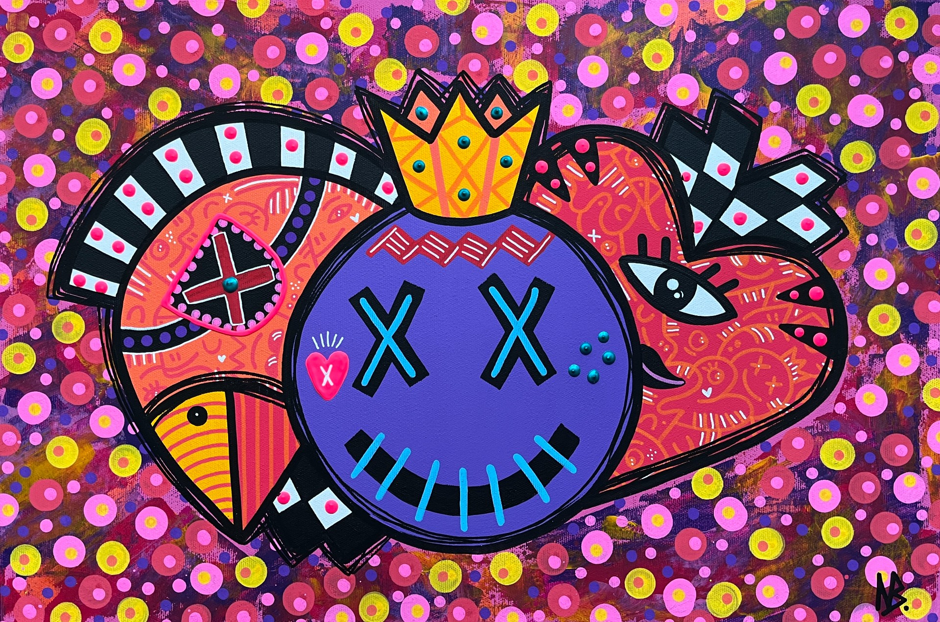Nina Bruneau est une artiste autodidacte, polyvalente et visionnaire qui ne cesse de repousser les limites de son art. Elle explore et mêle le néo-cubisme, le néo-pop art, l’art brut et l’art urbain avec panache, ce qui lui confère une esthétique pop et audacieuse. Ayant étudié l’histoire de l’art, la chromothérapie et l’art thérapie, Nina joue avec le pouvoir des couleurs et la superposition de motifs pour créer des œuvres vibrantes et captivantes qui réveillent notre âme d’enfant. Avec ses Pop’Monsters, personnages géométriques et hauts en couleur souvent représentés sous forme totémique, l'artiste peintre diffuse gaieté et souvenirs d’enfance insouciants.
