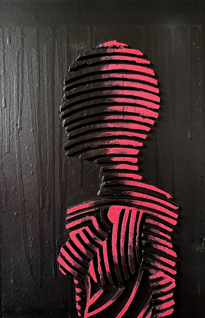Autodidacte ayant débuté par l’écriture, j’ai développé au départ l’aspect graphique pour présenter le texte avant que ce dernier ne prenne le pas sur les mots. Mon travail est principalement une recherche autour de l’humain et plus particulièrement de la représentation de l’être dans le regard d’autrui. La dualité entre la reconnaissance et la connaissance de l’autre et de soi-même. L’absence de visage et la transparence des silhouettes sont pour moi le moyen de faire entrer le spectateur dans ces dernières et de se les approprier. J’aime laisser le champ libre à chacun de s’en raconter l’histoire, d’y projeter ses envies, ses rêves, ses peurs, ses révoltes… J’apprécie de varier les supports, cartons entoilés, plexiglass, béton ainsi que les médiums bombe, peinture, posca, collages … Mes influences sont multiples de Francis Bacon aux surréalistes en passant par le mouvement Dada et le Street-art. Je défends l’idée que l’art peut être aussi sacré qu’insignifiant mais qu’il n’en reste pas moins vital et essentiel à chacun.