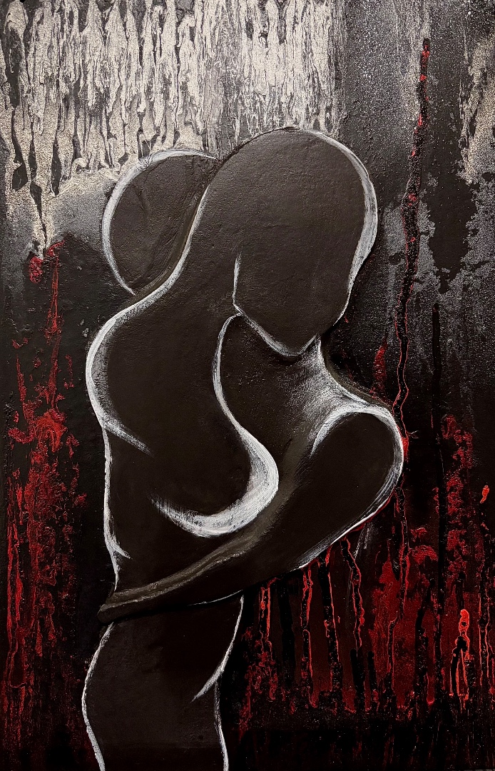 Autodidacte ayant débuté par l’écriture, j’ai développé au départ l’aspect graphique pour présenter le texte avant que ce dernier ne prenne le pas sur les mots. Mon travail est principalement une recherche autour de l’humain et plus particulièrement de la représentation de l’être dans le regard d’autrui. La dualité entre la reconnaissance et la connaissance de l’autre et de soi-même. L’absence de visage et la transparence des silhouettes sont pour moi le moyen de faire entrer le spectateur dans ces dernières et de se les approprier. J’aime laisser le champ libre à chacun de s’en raconter l’histoire, d’y projeter ses envies, ses rêves, ses peurs, ses révoltes… J’apprécie de varier les supports, cartons entoilés, plexiglass, béton ainsi que les médiums bombe, peinture, posca, collages … Mes influences sont multiples de Francis Bacon aux surréalistes en passant par le mouvement Dada et le Street-art. Je défends l’idée que l’art peut être aussi sacré qu’insignifiant mais qu’il n’en reste pas moins vital et essentiel à chacun.