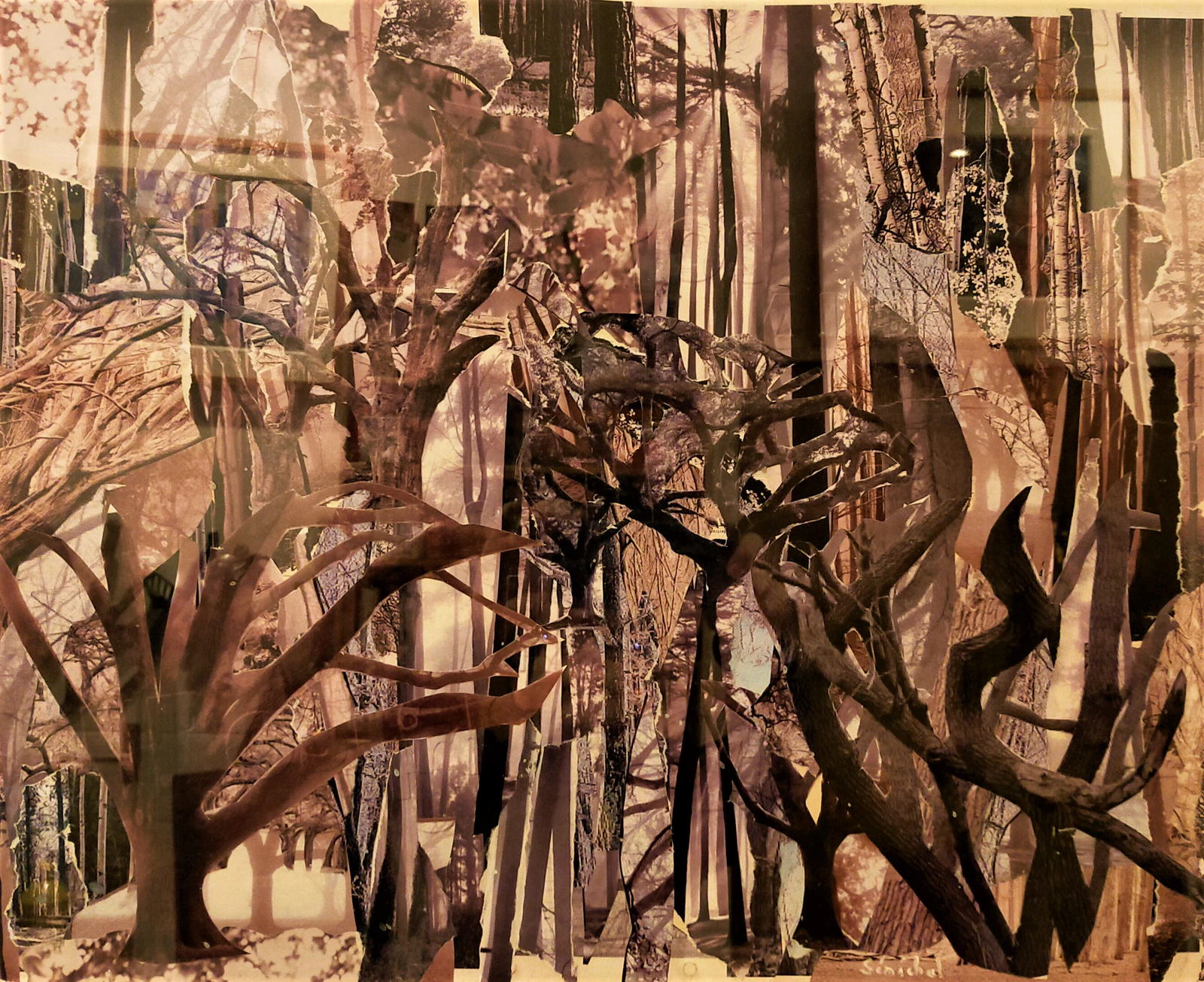 Une forêt pleine de mystère et de poésie pour une œuvre tout en camaïeux de gris, noir et blanc. Un collage qui prend ses lettres de noblesse dans un style totalement moderne et contemporain. L'artiste prend un malin plaisir à associer les couleurs qui bien que relativement similaires donne un grand contraste au tableau. La forêt, les arbres sont un thème cher à l'artiste. Même si elle vit en ville, elle est profondément écologiste et s’ingénie d'ailleurs à trouver des matériaux de récupération quand elle le peut. Encadrement sous verre.