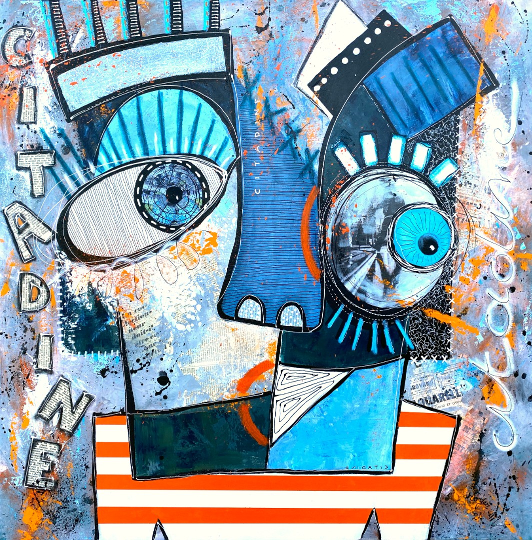 Ce tableau est une explosion semi-abstraite de formes audacieuses et de couleurs vibrantes. Ce visage évoque une complexité émotionnelle, interrogeant les thèmes de l'identité et de la perception de soi et des autres . Les mots et les collages de lettres apportent une ambiance urbaine. C’est un portrait qui porte un esprit énergétique, apportant dynamisme et réflexion à tout espace.