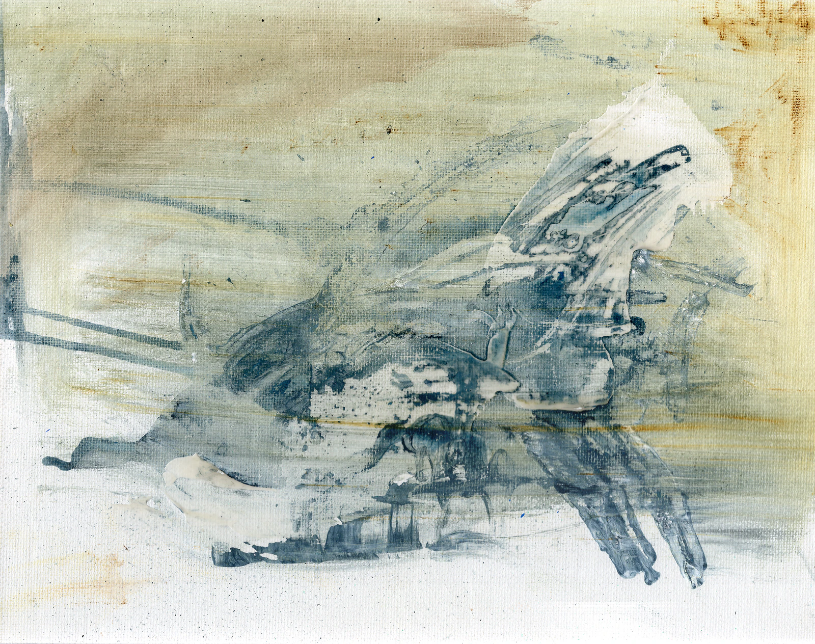Cette œuvre est née d’un test que j’ai réalisé sur un carton entoilé. Après avoir déposé du gel de structure sur la surface, j’ai commencé à tester l’encre acrylique et la peinture acrylique diluée dans l'optique de créer un nouveau paysage abstrait. Très vite la structure naissance a imposé des formes signifiantes pour moi. Sous l’emprise de la paréidolie, j’y ai vu des silhouettes animales telles qu’un cheval, un daim et un oiseau entremêlés dans une fuite. Les traits de peintures poches de l'esquisse, tracent des lignes cinétiques qui suggèrent la vitesse et donne un aspect dynamique au mouvement des sujets à moitié effacées. L’expérience de ce résultat inattendu a été pour moi une réussite sur le plan créatif.