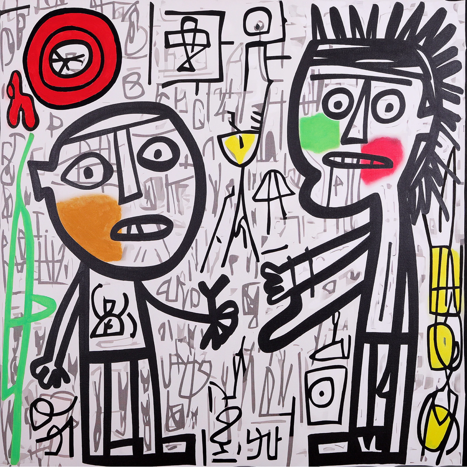 Cette œuvre met en scène une interaction à la fois familière et déconcertante entre deux personnages à l'attitude incertaine. Le trait noir épais, sculpte des figures expressives aux regards fixes et aux postures tendues, tandis que le fond foisonne d'inscriptions et de symboles, comme un langage codé entre les protagonistes. L'un, au visage rond, semble hésitant ou perplexe, tandis que l'autre, plus imposant avec ses cheveux hérissés et ses joues colorées, paraît animé d'une énergie brute. L'échange entre eux est ambigu : dialogue maladroit, confrontation ou retrouvailles étranges ? Les touches de couleur vives — rouge, vert, jaune — viennent souligner l'intensité de la scène, contrastant avec l'arrière-plan saturé de motifs presque tribaux, qui ajoutent une dimension rythmique et hypnotique à l'œuvre. Avec une esthétique qui flirte avec l'art brut et le néo-expressionnisme, évoque la complexité des liens familiaux, entre complicité et distance, entre mémoire et interprétation subjective des relations passées. Œuvre de ma série "FAMILY" COUSIN HUB 100 x 100 cm Peinture et marqueur acrylique, sérigraphie (fond) Année : 2024 1/1 Toile en coton montée sur châssis bois 3D Encadré avec une caisse américaine en escalier noire Signé sur le bord droit et contresigné au dos Livré avec certificat d'authenticité
