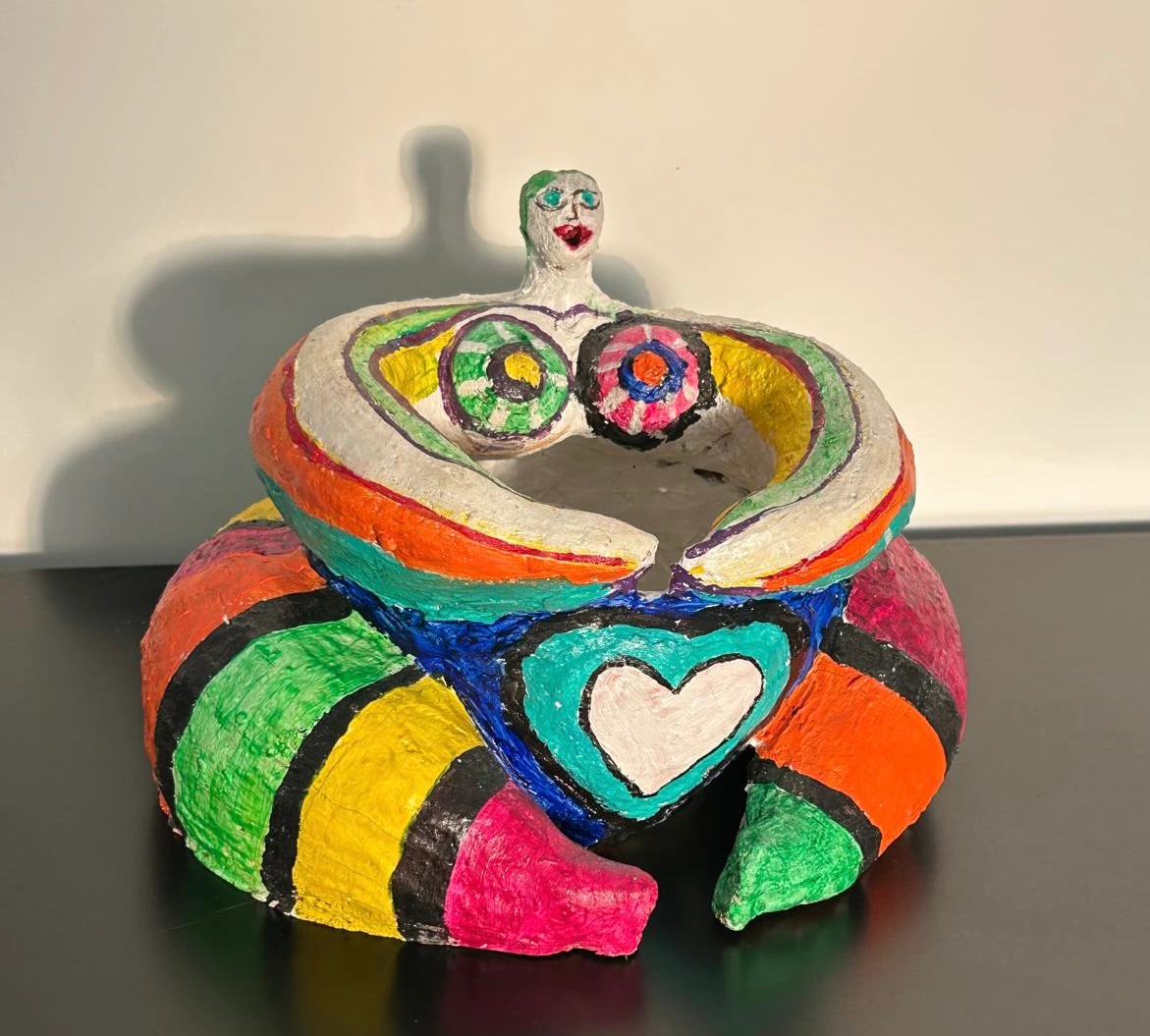DAME DE COEUR -oeuvre unique- Ouverte, rassurante, réconfortante, joyeuse, cette éternelle Mama. Elle nous offre ses bras, son amour, son cœur. Qui viendra ? J’ai créé cette sculpture pour célébrer la force et la joie féminine. Les couleurs vives et les formes généreuses dégagent une énergie vibrante, un hommage à l’amour et à la vie. Elle apporte une présence chaleureuse, joyeuse et pleine de vitalité, animant toute pièce d’une émotion profonde et d’un éclat pur.