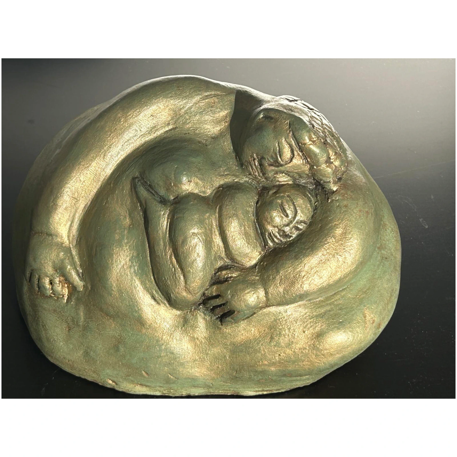 Pièce unique, DIVIN SOMMEIL explore cet instant suspendu où les corps se confondent, où l’individu s’efface dans une forme plus vaste, protectrice et enveloppante. La figure maternelle devient ici matrice : elle englobe, abrite, dissout les frontières entre soi et l’autre. La sculpture évoque la fusion originelle, l’abandon confiant, la mémoire archaïque d’un bien-être océanique que chacun porte en soi. Les courbes continues guident le regard dans un mouvement circulaire, sans rupture, invitant au repos du corps comme de l’esprit. Par sa matière minérale et sa patine inspirée du bronze, l’œuvre s’inscrit dans une temporalité lente, presque archaïque. Elle ne raconte pas une scène, mais un état : celui de la paix profonde, de l’amour inconditionnel, du sommeil comme refuge. Divin Sommeil est une œuvre de présence, pensée pour diffuser une énergie apaisante et rassurante dans l’espace qu’elle habite