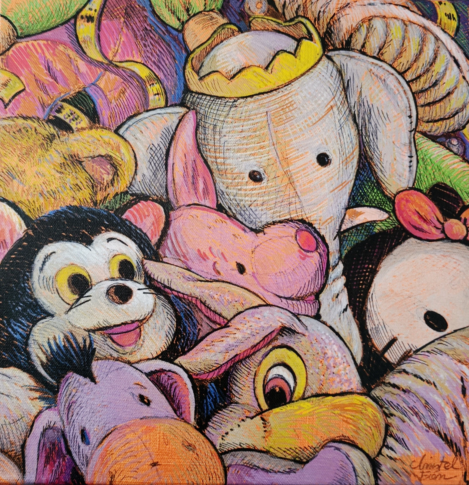 Dans cette œuvre, j'ai voulu capturer la tendresse et la nostalgie des peluches d'enfance dans une composition joyeuse rendue par l'entassement des personnages. Les personnages familiers sont dessinés aux feutres acryliques métallisés, semblent figés dans une tendre compagnie, invitent à ressentir chaleur et réconfort. Cette peinture apportera à votre intérieur une énergie joyeuse et une profonde sensation de complicité et d'innocence retrouvée.