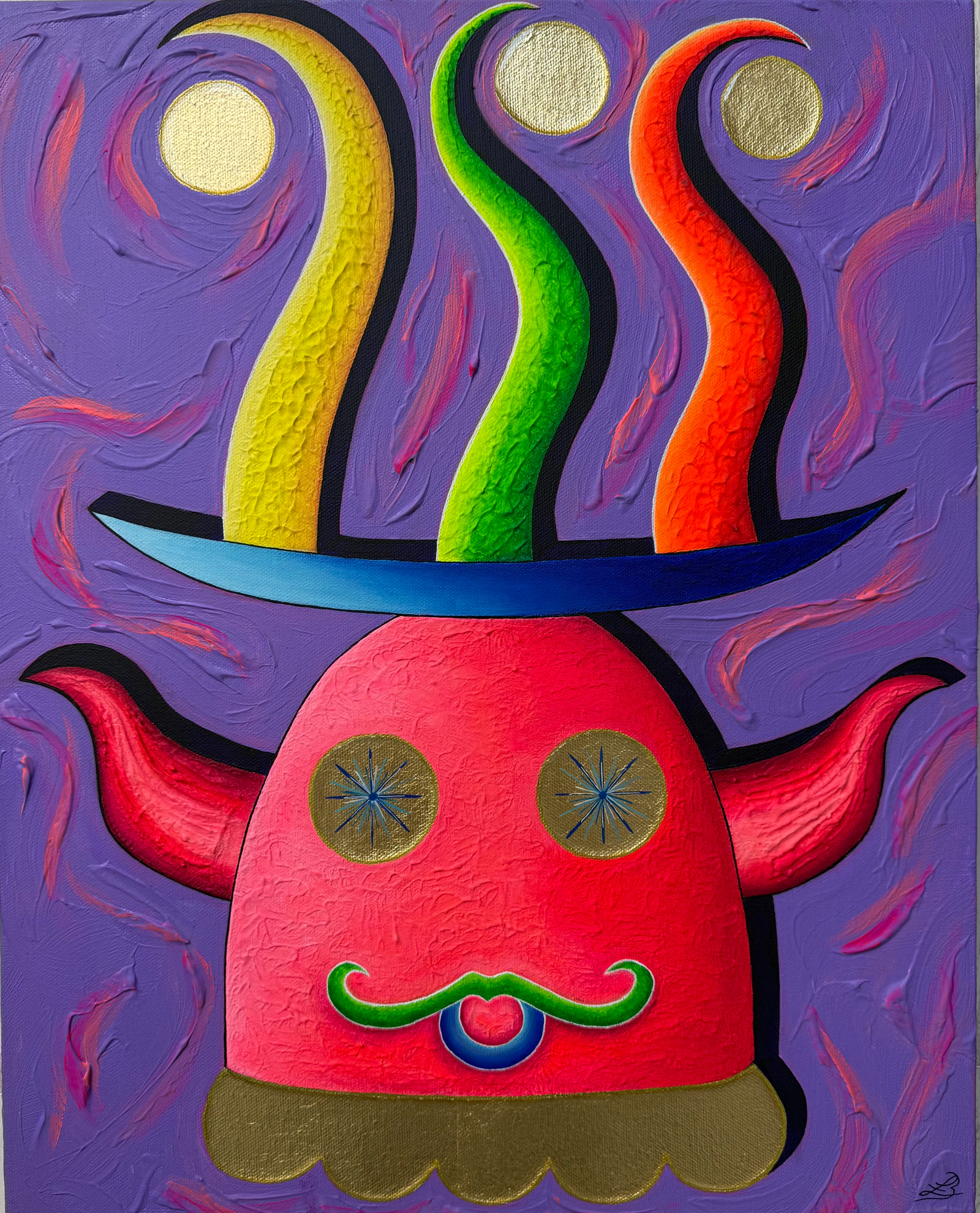 Oser croire en la magie de la nuit. Ce petit être semble sorti d’un autre monde. Celui du rêve. Les boules dorées sont des pensées lumineuses, des rêves que l’on garde au fond de soi. Ses tentacules les protègent comme une promesse silencieuse. Ses yeux, pleins d’étoiles, murmurent doucement que la nuit n’est pas faite pour fuir le monde, mais pour l’imaginer autrement.