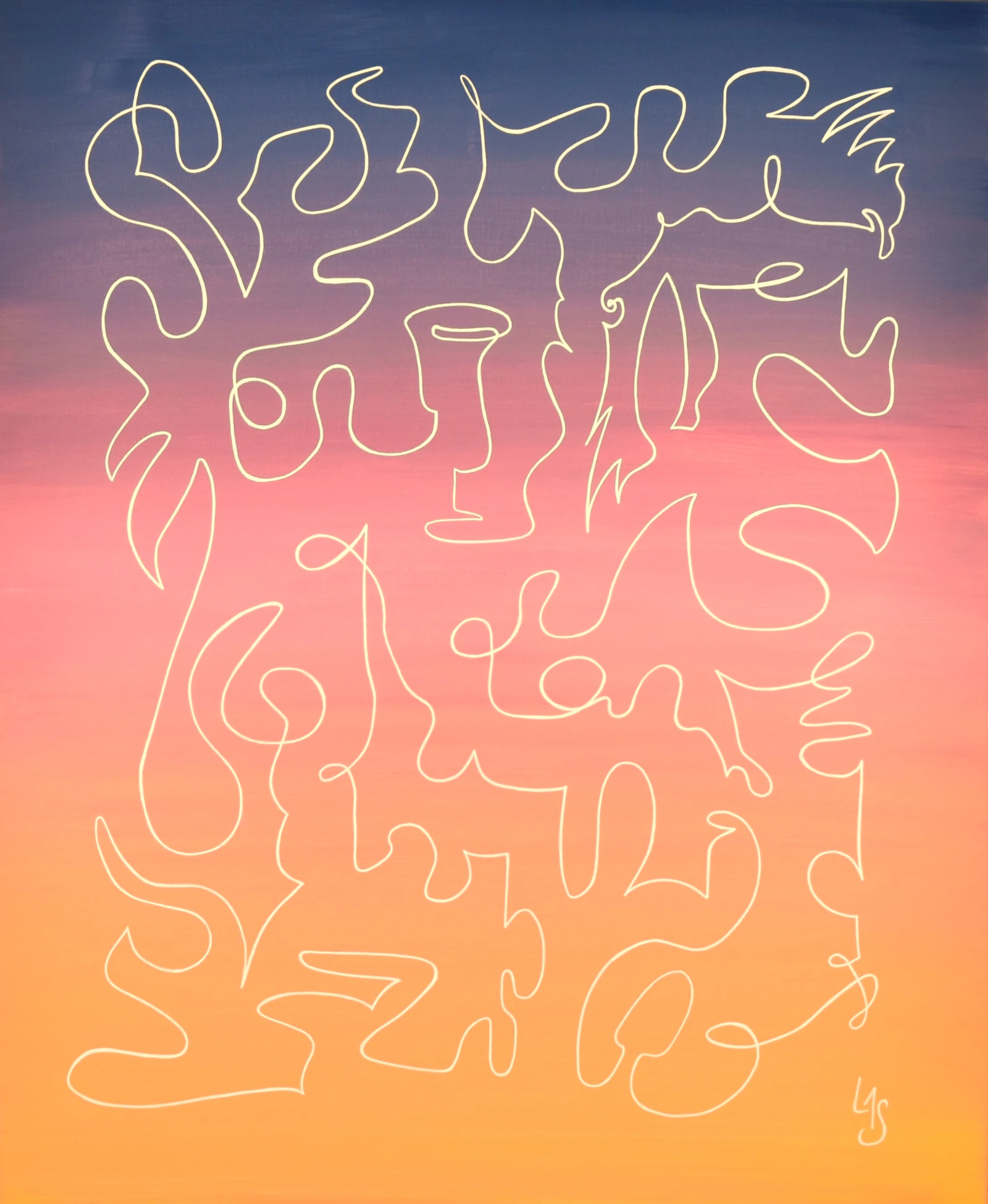 Dans cette œuvre, le fond dégradé va du jaune vibrant au rose, puis au violet, rappelant la puissance et la magie d'un coucher de soleil, où les teintes se mêlent dans une harmonie presque irréelle. Les graphismes blancs, tracés d'une seule ligne, évoquent l'insouciance et la liberté ressenties dans ces instants éphémères, ainsi que l'émotion liée à ces souvenirs précieux. C'est à travers de formes abstraites : des courbes et des ondulations que la détente er l'évasion éprouvées de dévoilent. Cette ligne continue, comme un fil conducteur, capte l'esprit de mes pérégrinations et illustre l'esprit des vacances. L'œuvre retranscrit l'essence de ces instants suspendus, où la beauté du moment se confond à la sérénité infinie de l'horizon.