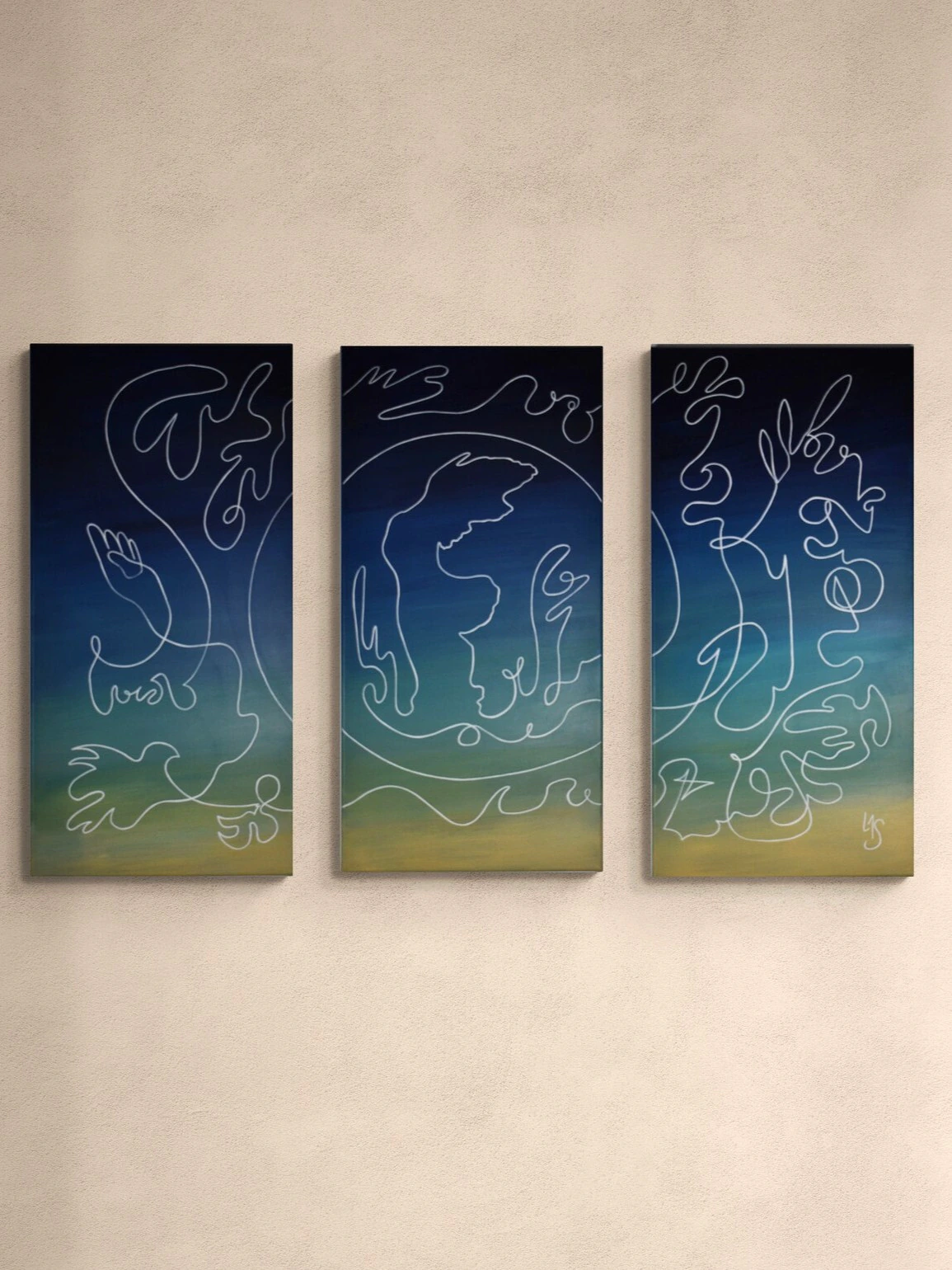 « ECHO POUR LA PAIX » est un triptyque composé de 3 panneaux de 80cm de hauteur par 40 cm de largeur, réalisés à l’acrylique. Le choix du triptyque n’est pas anodin : il incarne l’idée d’équilibre, de dialogue entre les parties, de respiration visuelle. Le fond du tableau se déploie en un dégradé de teintes allant de l’ocre clair au bleu profond, en passant par des nuances de turquoise. Cette palette crée un horizon de couleurs apaisantes : le bleu profond suggère le rêve et le ciel, le turquoise évoque la fluidité de l’eau, et l’ocre clair renvoie à la stabilité de la terre. Ces éléments (ciel, eau, terre) constituent un socle symbolique, un rappel que notre monde, dans sa simplicité originelle, est porteur de paix et d’harmonie. Sur ce fond, un trait blanc, tracé d’un seul geste continu traverse les 3 panneaux et esquisse des graphismes qui s’entrelacent et se chevauchent. Ils évoquent diverses allégories et autant de symboles universels : une branche d’olivier, une colombe, une main en prière... Certains décèleront la Terre, d’autres un ange ou peut-être les ailes d’une victoire silencieuse sur l’obscurantisme. Comme un fil entre l’artiste et le spectateur, je tisse un lien avec lui et engage un jeu où chacun est invité à déceler ces formes ou à inventer sa propre interprétation. « ECHO POUR LA PAIX » est un appel à l’universalité, à la contemplation, et à la résonance intérieure de ce que la paix peut signifier pour chacun.