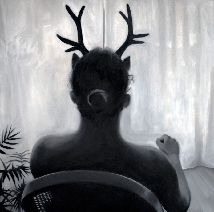 «Dans la mêlée des corps suppliciés, des bras tendus et des mains suppliantes ; dans la mêlée des membres, des jambes où rampe un spasme ; près des têtes inertes, des yeux éteints, des paupières pesantes ; dans la mêlée des bouches desséchées, la confusion des langues et des gémissements [...] des corps nus qui s’éteignent.» Claude Cahun, Héroïnes, 1924. Ce travail fit irruption au milieu de réflexions sur l’objet de l’automate et sur la notion d’hétérotopie, ces lieux sans lieux propices à accueillir l’imaginaire. Dans ces conditions, je décide de m’atteler à l’élaboration d’une peinture en monochrome très contrasté reprenant mon personnage fictif. L’espace (segmenté) intérieur fermé - mais sans bords et sans surface - est travaillé comme l’espace inconscient où se rencontrent les invisibles. Le rideau ici le rôle d'un écran, une séparation elle même scindée sur laquelle se projettent les ombres et lumières étrangères à notre connaissance. Le chaise bascule là où le corps et l'esprit s'altèrent. «Nous pouvons désormais sentir et nous mouvoir à distance, en un lieu où nous ne sommes pas, palper, toucher, pénétrer un monde, sans y être corporellement et matériellement parlant. Le dispositif […] permet aux individus de palper leur double.» Florence de Mèredieu, à propos de la télé-présence, Histoire matérielle et immatérielle de l’art moderne et contemporain, 1994