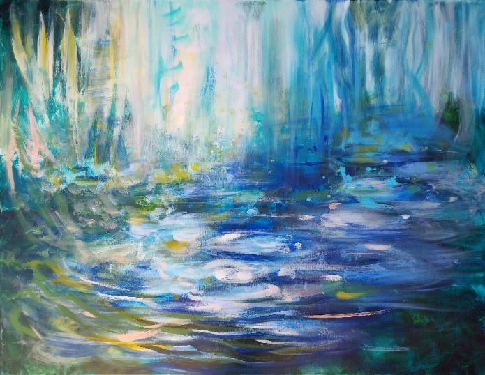 Dans cette version d'éden, j'ai accentué la lumière et la transparence afin de donner à ce paysage plus figuratif qu'abstrait un caractère surnaturel, l'ambiance irréelle provenant principalement des zones de lumière vive dont on ne peut deviner la source avec certitude. La perspective spatiale quant à elle, contribue à apporter un peu de réalisme dans ce décors naturel au même titre que certains éléments d'allure végétale évoquant différentes formes de feuilles. De nombreuses couches de peinture en glacis ont été nécessaires pour représenter l'aspect diaphane du plan d'eau et de la végétation suspendue. La dominante de couleurs bleues accentue également cette impression d'ambiance féerique et mystérieuse. Ce travail à été ponctué d'un certain nombre de pauses permettant le recul nécessaire à la réalisation de cet équilibre fragile entre figuration et abstraction.