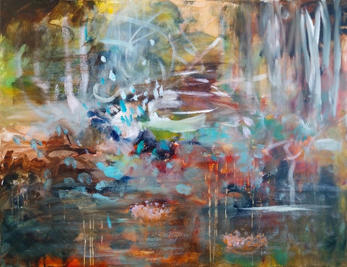 J'ai peint ce tableau dans un certain état de fulgurance, sans poses, enchaînant les étapes de façon automatique, laissant de côté toute forme de réflexion, d'analyse et de jugement. Seul l'œil et l'instinct, soutenus par la mémoire musculaire et gestuelle ont été en état de veille intense. Le caractère contraignant de l'effort avait disparu au profit d'une légèreté d'exécution, comme étant conduite par un modèle invisible que seul mon inconscient percevait. Le milieu naturel est ici représenté par le monde terrestre et le monde aquatique qui s'entremêlent sur un même plan par le biais de touches abstraites figurant une végétation joyeuse. L'équilibre fragile entre les couleurs procède d'une mise en place purement intuitive et contribue à l'impression de délicatesse qui émane de l'ensemble. Afin de rendre la peinture plus liquide pour une application plus fluide, je l'ai mélangée à du médium brillant pour acrylique, ce qui a occasionné de la transparence sur certaines couleurs.