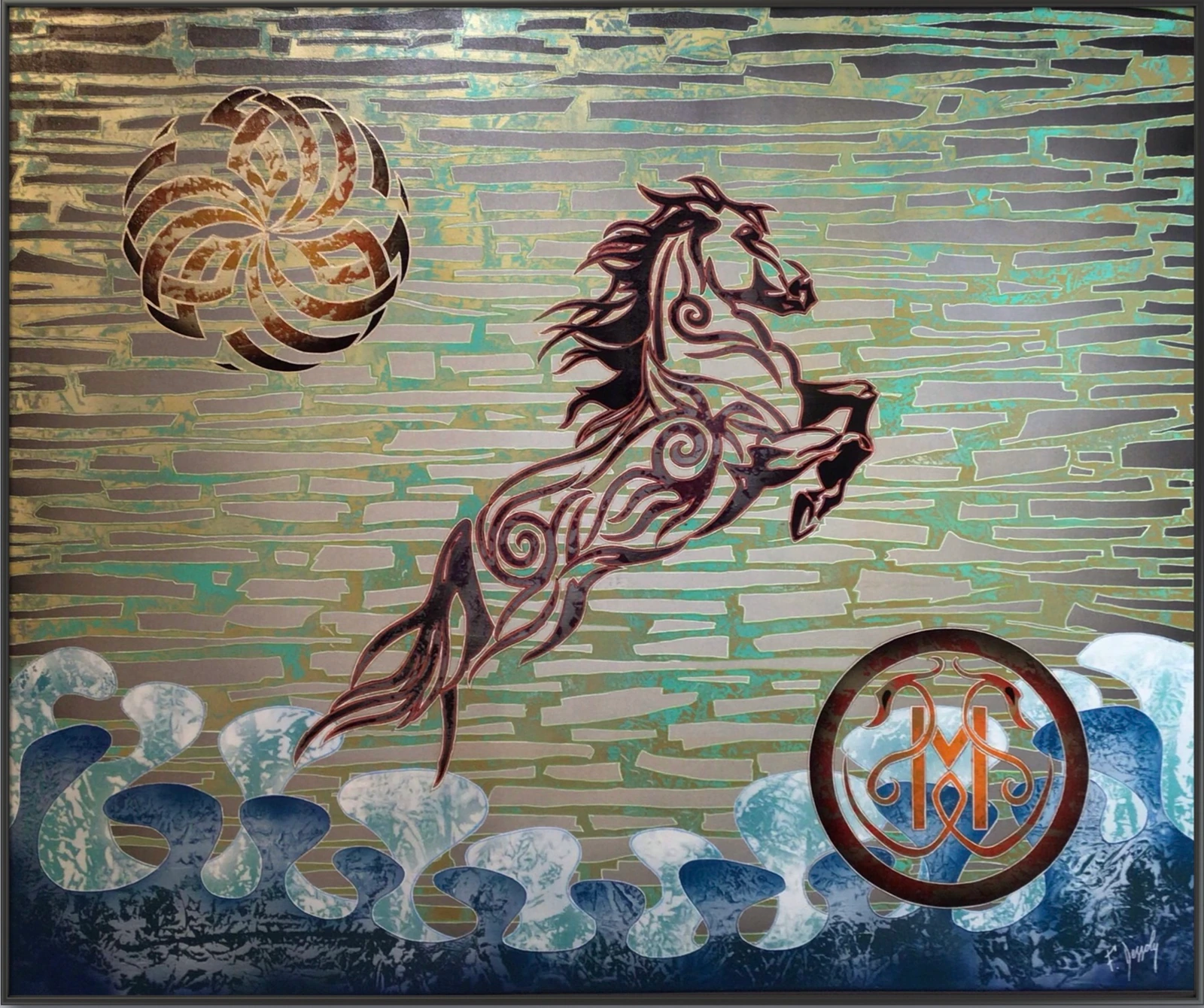 Œuvre d’art contemporaine, qui évoque la rune EHWAZ et la symbolique du cheval. Symboles anciens dans un style moderne, ce travail s’inscrit dans le mouvement des arts vibratoires. Symbole d’un changement rapide, d’une aide demandée et reçue dans un délai assez prompt. C’est une Rune liée au soutient, celui-ci, viendra des autres pour que nous puissions évoluer vers un but meilleur. Ehwaz est aussi annonciatrice d’un voyage ou de vacances à venir, d’une confiance en soi et dans les autres, d’une forme de loyauté vis-à-vis de ceux qui vous aide.