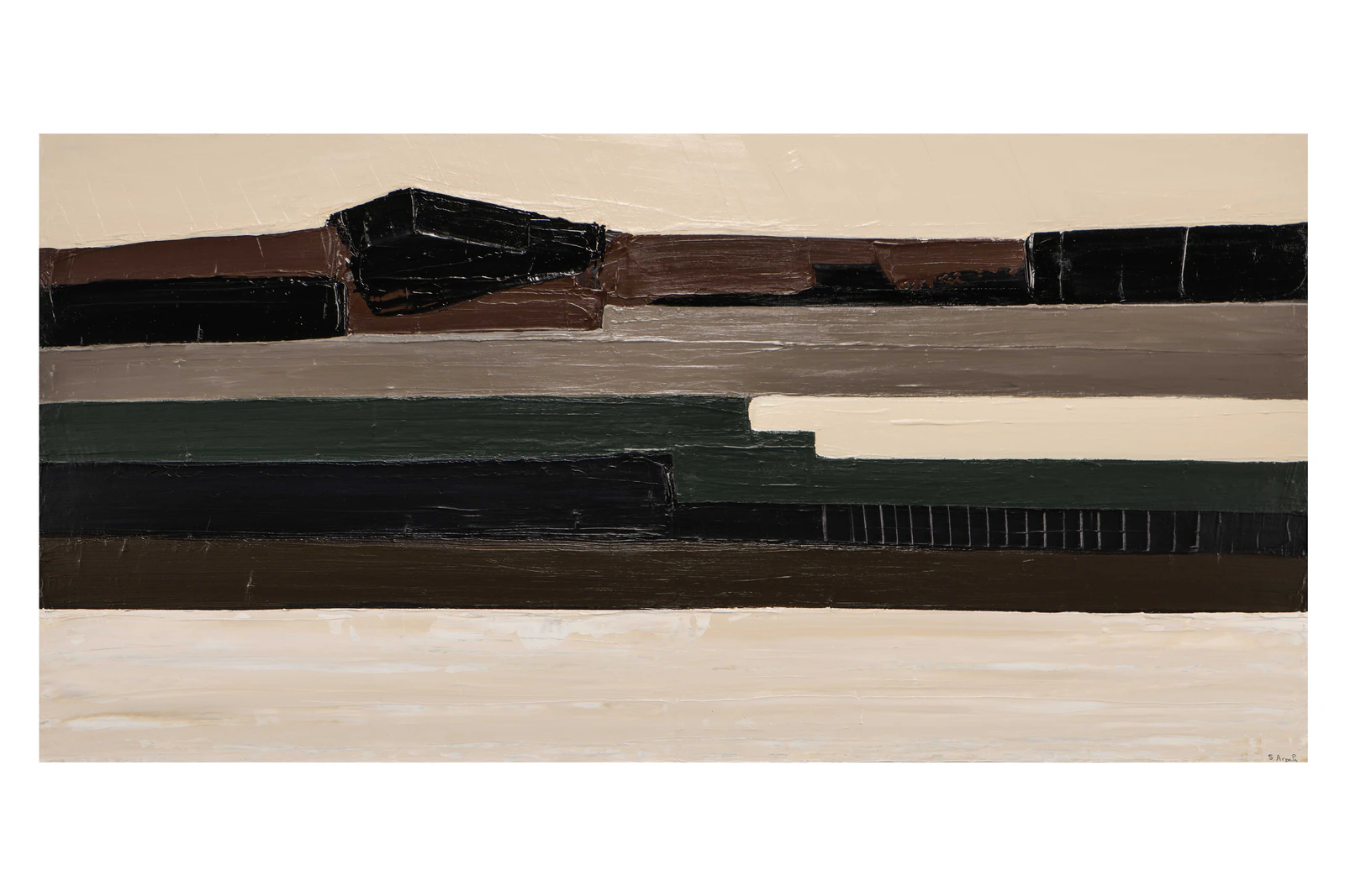 Ce chemin est né de mon expérience du Cachemire et de l’Himalaya. J’y ai conservé la présence minérale des paysages, leur densité silencieuse. Dans ce format horizontal étiré, j’ai voulu créer des chemins graphiques, presque infinis, des lignes qui traversent l’espace comme une invitation au départ. Les femmes ont disparu ici. Elles laissent place au territoire, à la matière, à cette sensation d’aller ailleurs, vers un espace intérieur encore inconnu. La texture devient paysage. Le chemin devient passage.