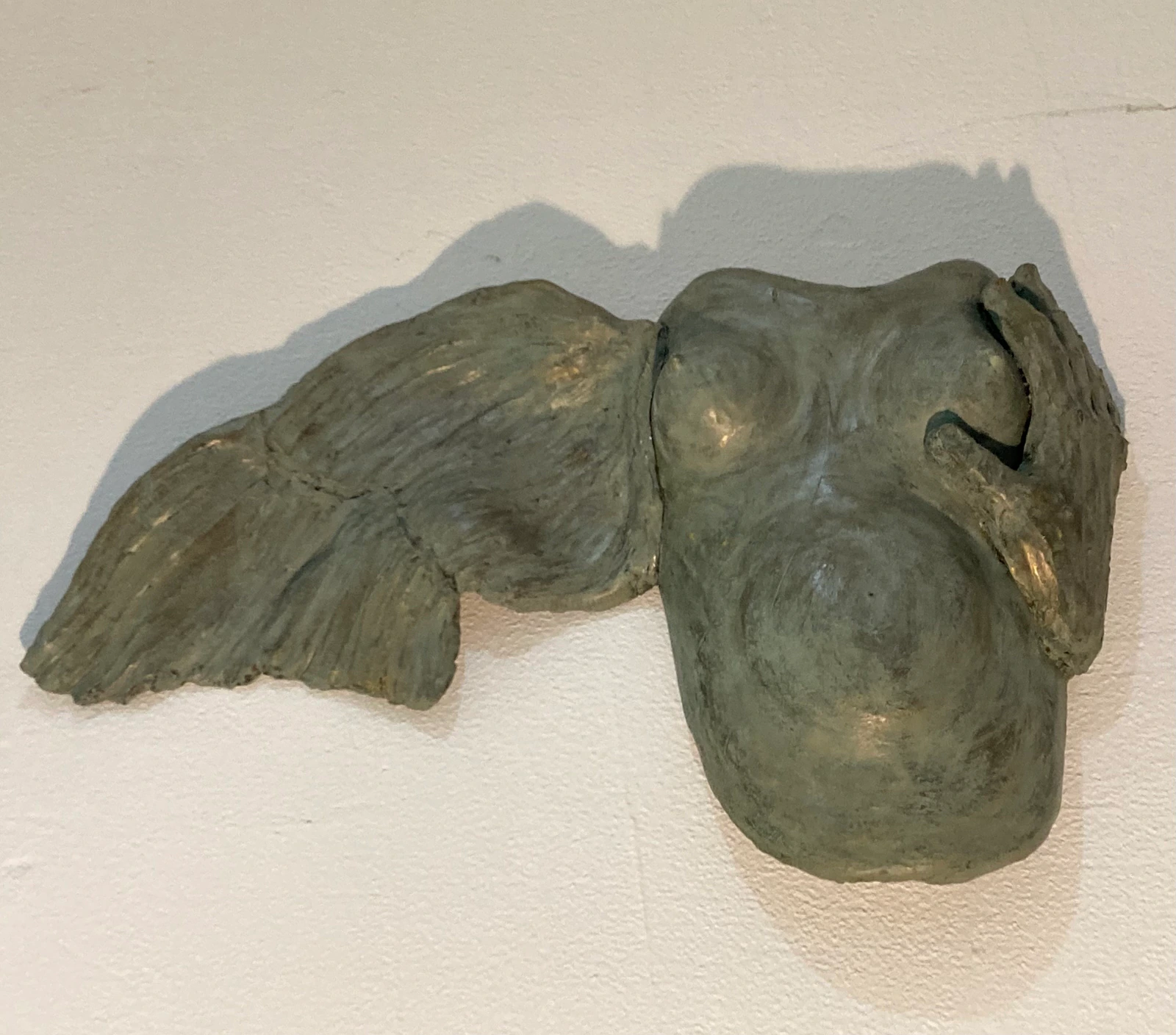 Corps fragmenté, suspendu entre ancrage et élévation, ENTRE CIEL ET CHAIR met en tension deux forces opposées : la densité du vivant et l’appel de l’ailleurs. Le buste, charnel, presque vulnérable, se prolonge d’une aile — non pas déployée dans un élan héroïque, mais retenue, comme alourdie par la matière même qu’elle cherche à quitter. La sculpture ne raconte pas une métamorphose achevée, mais un état intermédiaire. Un passage. Celui d’un être qui oscille entre chute et envol, entre poids et désir de légèreté. La patine, aux nuances sourdes et organiques, renforce cette ambiguïté : ni tout à fait terrestre, ni complètement céleste. Elle inscrit l’œuvre dans une temporalité lente, presque archaïque, comme si cette tension habitait le corps depuis toujours. ENTRE CIEL ET CHAIR interroge ainsi notre propre condition : ce point d’équilibre fragile où coexistent l’aspiration à s’élever et l’irréductible attachement au corps.