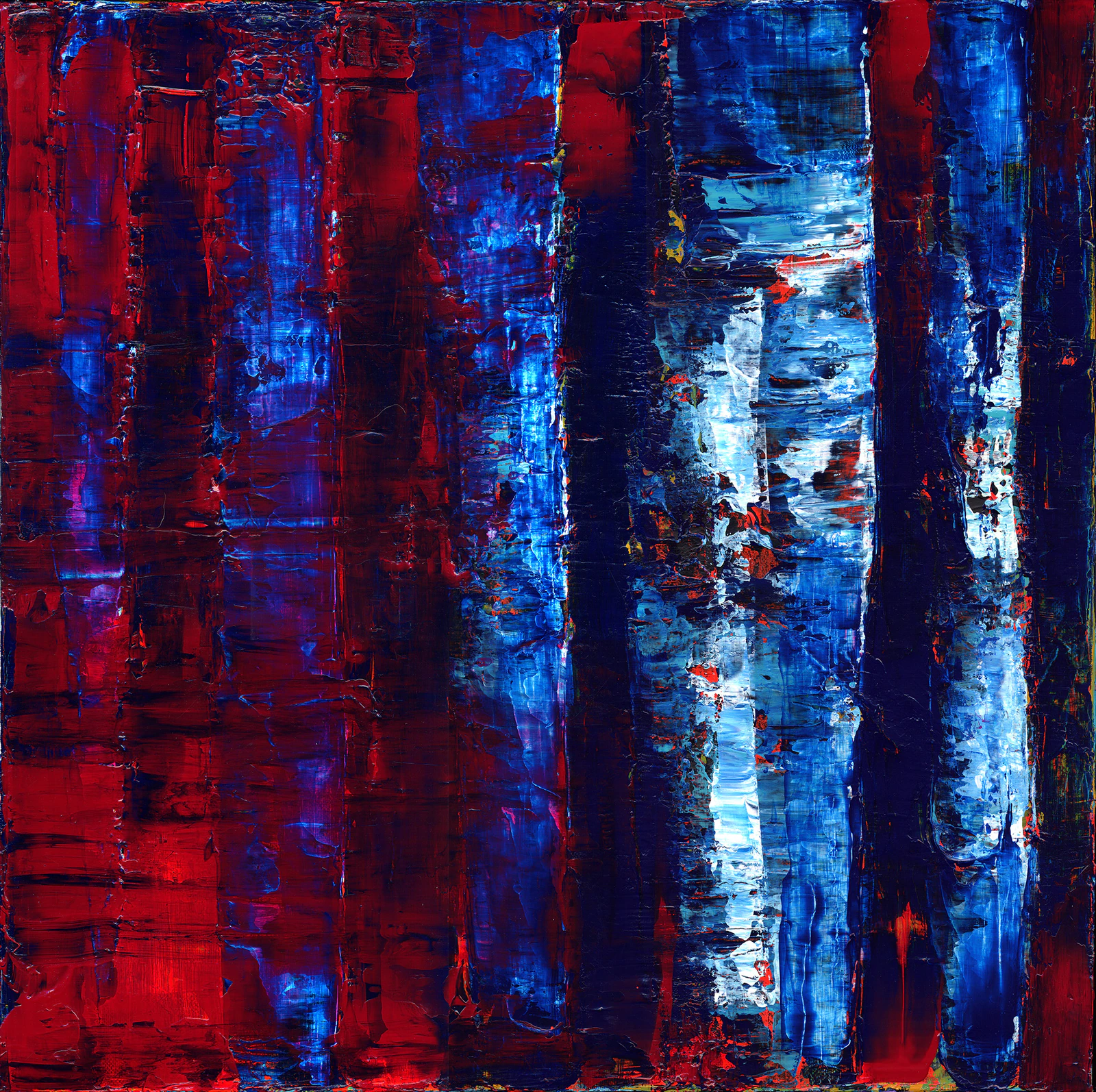 Forêt 1 a été entièrement peinte au couteau en couches épaisses. Le cadrage serré sur les représentations presque abstraites de troncs d'arbres enlève toute perspective axiale, accentuant l'impression d'un lieu clos et induit l'ambiance intimiste et profonde que l'on peut parfois éprouver dans les espaces densément boisés.