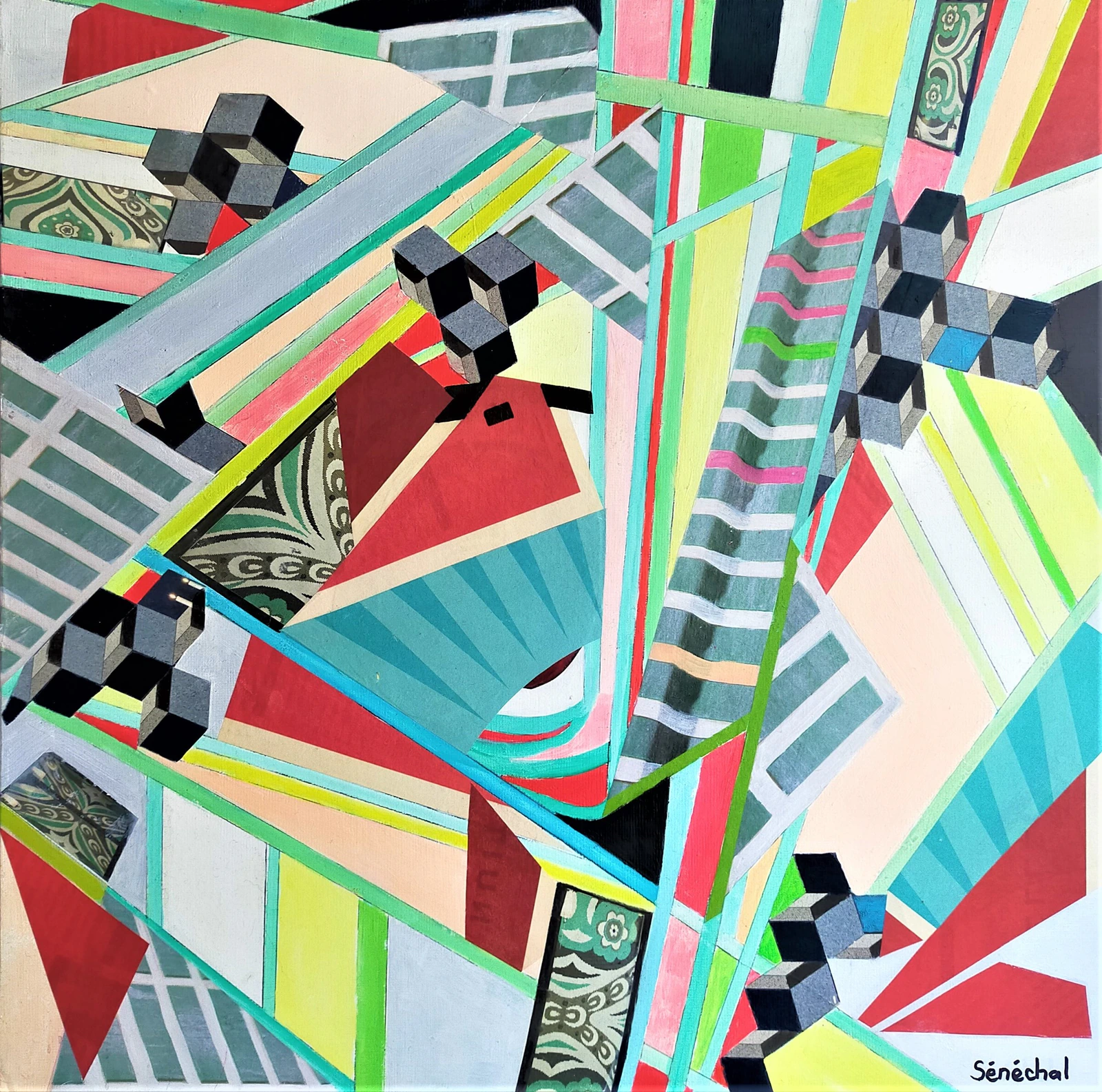 Paris, toujours Paris. Ce tableau représente la voute du Grand Palais dont les verrières ont été restaurées récemment et l'artiste est une vraie "fan" de ce bâtiment de la Belle Époque dans lequel elle exposé régulièrement. Elle s'est inspirée du plafond de ce architecture surprenante pour nous embarquer dans un style cubique du plus bel effet, avec la lumière de cette structure et les escaliers et les étages qui garnissent si savamment ce bel édifice. Elle a pour projet de peindre ce dernier à côté du si élégant Pont Alexandre III. Le tableau a été peint à l'huile et l'artiste s'est amusée à ajouter par ci par là quelques morceaux de papier qui donne de la profondeur au tableau et un dynamisme contemporain.