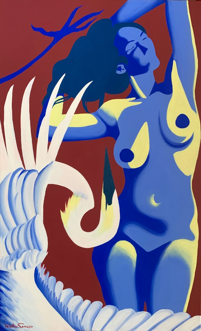 Née en 1999 en bordure de Paris, Valentine Sarrazin s’amourache très tôt des arts graphiques. Elle entame premièrement un cursus de bande dessinée qui l’amène à être publiée à la sortie de ses études avant de se concentrer pleinement sur la peinture. C’est à travers un univers coloré, chaud, aux lignes sensuelles qu’elle exprime ses mondes intérieurs.