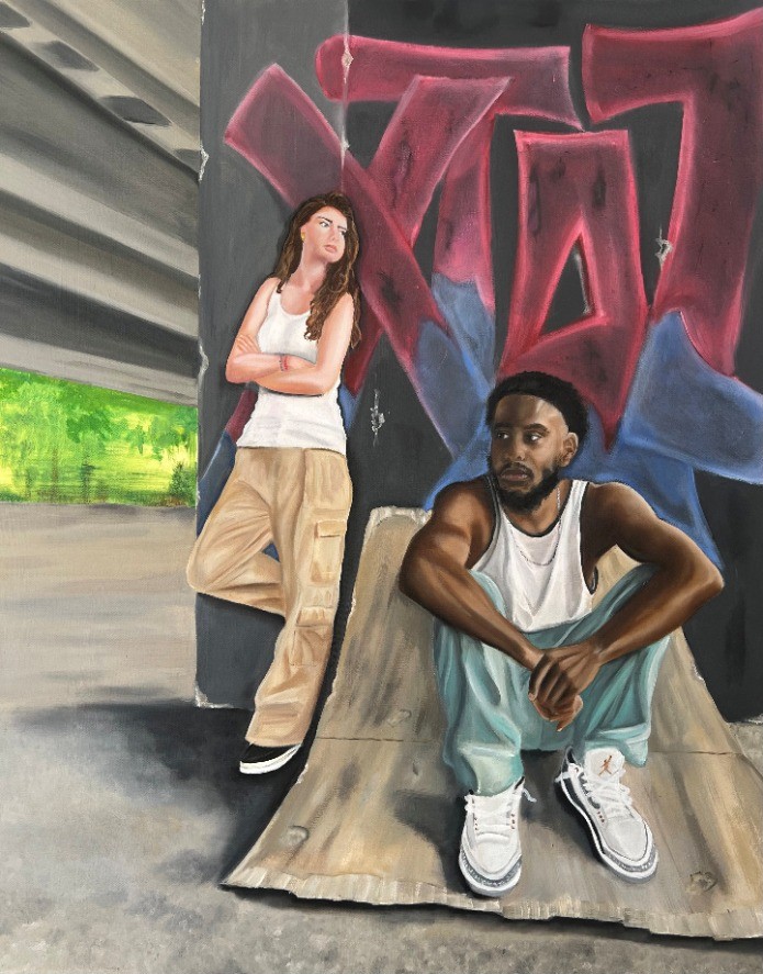 Deux jeunes gens sous le périphérique, entourés par un décor de béton, le regard perdu vers l'horizon, ensemble mais chacun à leur rêverie, semblent attendre un avenir meilleur.