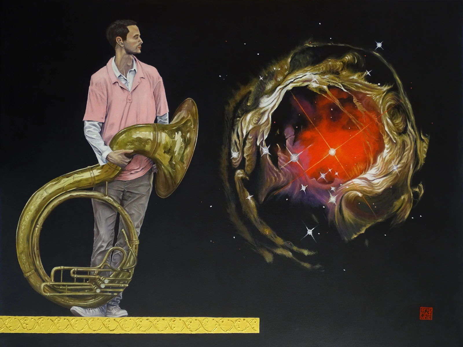 Musicien jouant de l'hélicon contemple une nébuleuse dont la couleur rappelle son instrument