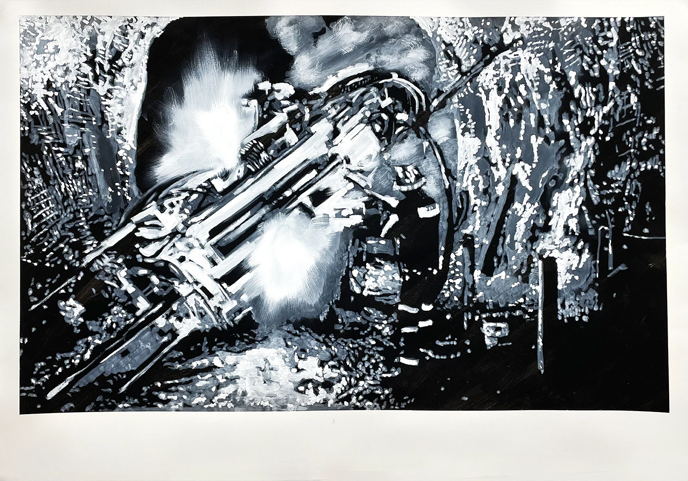 Peintures sur papier représentants une mine de fer contemporaine. Gesso noir et peinture à l’huile blanche.