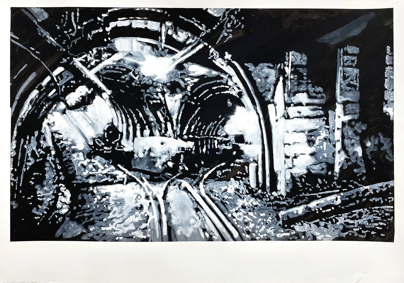 Peintures sur papier représentants une mine de fer contemporaine. Gesso noir et peinture à l’huile blanche.
