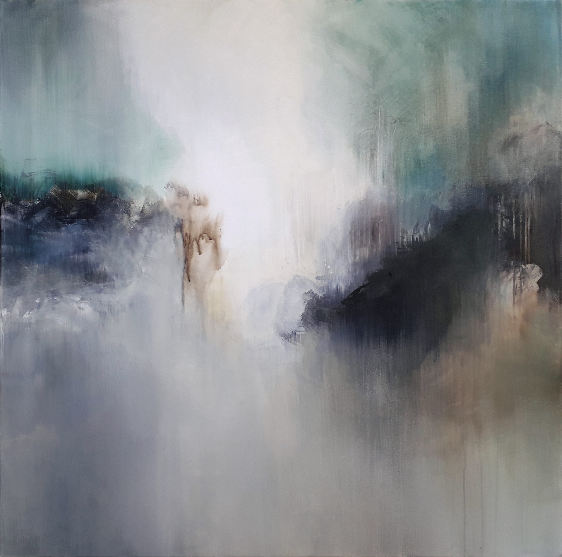 Comment rendre compte du non manifesté, de l'intangible, de l'immatériel ? Il fallait évidemment que je passe par l'abstraction pour parvenir à peindre serait-ce qu'un vague aperçu d'une réalité inaccessible. Dans cette représentation d' un paysage éthéré, la lumière, tel un souffle inextinguible, habite chaque particule de la nature pour lui donner ses couleurs et ses vibrations. Elle est la source vitale qui fait naître les paysages dans un flot de matière informelle pour les conduire à la quintessence. C'est ainsi que j'imagine un lieu non terrestre, appartenant à un univers parallèle au nôtre. La couleur Turquoise m'a semblé être la plus appropriée pour rendre compte d'une nature sublimée.