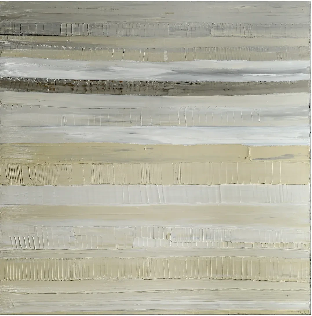 Dans cette œuvre, j’explore l’espace fragile entre le visible et l’invisible. Les teintes claires dessinent des chemins lumineux qui semblent se prolonger vers l’infini. Aucune figure humaine n’y apparaît : seulement des traces, des passages, et la question silencieuse de ce qui nous attend au-delà.