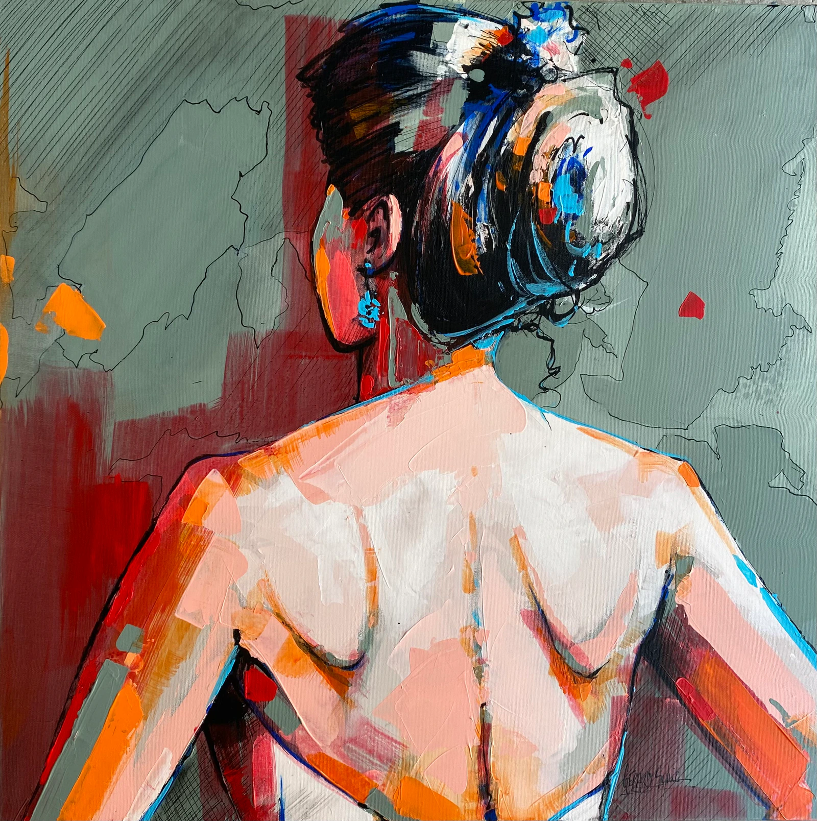 Dans cette œuvre, j'ai exploré la fusion de l'acrylique et de l'encre de Chine pour capturer l'élégance et l'audace. Le style est un hommage aux bandes dessinées et à l'art pop, avec une figure féminine de dos qui incarne à la fois mystère et confiance. Les couleurs vives et le contraste fort témoignent de l'énergie puissante qu'elle apportera à tout espace, inspirant courage et créativité. C'est un cri visuel de prêtise à embrasser pleinement les défis avec grâce.