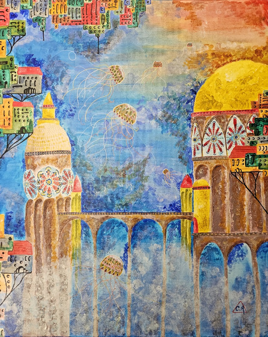 J’ai peint ce tableau comme on entrouvre une fenêtre sur un monde rêvé. La migration des Méduses est une échappée douce, loin du poids du réel — un passage suspendu entre ciel et mer, où les villes flottent, les couleurs respirent, et les méduses dansent en silence vers un ailleurs. Elles portent en elles le renouveau, lentes messagères d’un monde en transformation. Cette peinture est un souffle, une invitation à suivre le courant du rêve, là où tout redevient possible.