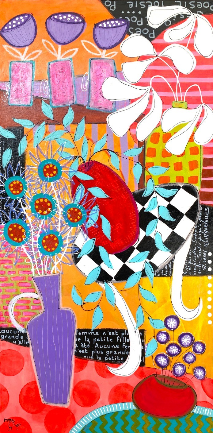 « La Poésie des fleurs », est une exploration de la figuration narrative et poétique où le végétal devient un prétexte à une symphonie chromatique. Les éléments floraux stylisés – les larges pétales blancs aériens, les fleurs turquoises aux cœurs rouges, les petits bouquets violets – sont encadrés par des formes géométriques pures : un vase violet aux lignes souples, un récipient rouge aux accents surréalistes, et l'irruption inattendue d'un motif damier noir et blanc qui ancre la composition dans une modernité ludique. Fidèle à sa démarche, Roger.M intègre des fragments de texte, des bribes de poèmes. Le format vertical accentue l'élan ascendant des fleurs et la superposition des plans, invitant le regard à une ascension joyeuse au sein de ce jardin secret et décomplexé. Roger.M utilise ici la couleur non pas pour représenter le réel, mais pour exprimer une sensation, une émotion, une harmonie intérieure.