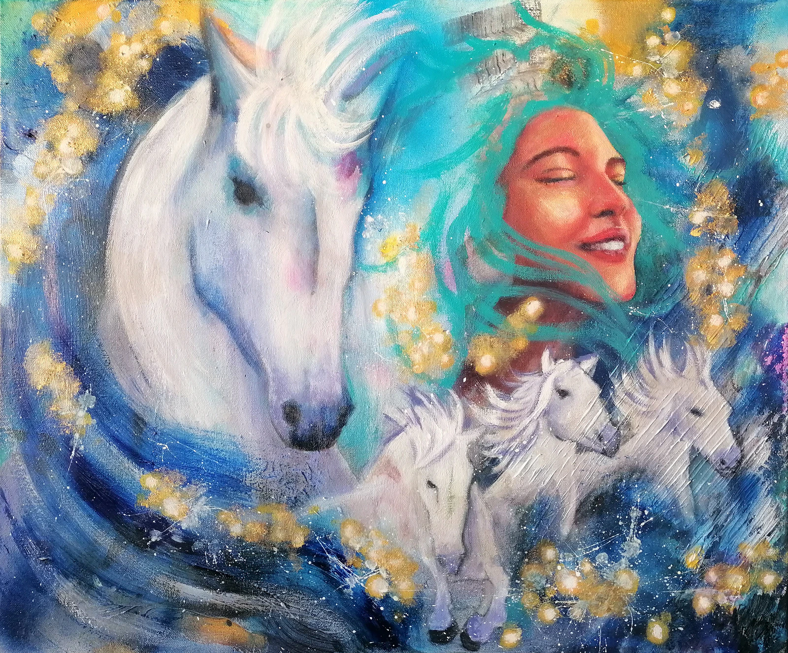 Les Chevaux sont entrés dans ma vie, au moment de la conception de cette peinture, pour m'apporter leur soutien et me rappeler le vent de liberté qui attend chaque personne, profondément dédiée à sa propre libération intérieure.