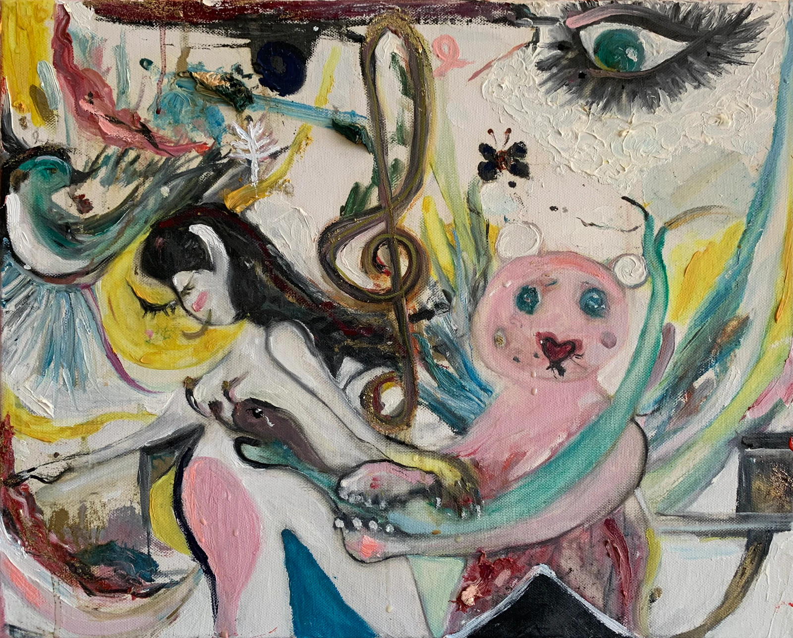 « Puisant son inspiration dans son subconscient, l’artiste raconte des histoires, des mythes, dans une esthétique naïve et enfantine contrastant avec la complexité des sujets traités. Envisageant la peinture comme une démarche psychanalytique, elle oscille entre figuration et abstraction et nous délivre une oeuvre très personnelle, à mi-chemin entre expressionnisme et symbolisme. » Lumina Wang, artiste-plasticienne et comédienne d’origine taïwanaise. Passionnée par les arts dramatiques et la mythologie, son univers singulier est retracé par des signes symboliques et une intrigue d’art dramatique. Il existe notamment une ambiguïté ludique dans ses peintures : un langage naïf voulu pour traiter des sujets complexes et psychologiques, comme les secrets familiaux, la nostalgie ou les traumatismes d’enfance, la féminité cachée ou assumée, l’interaction relationnelle, la passion et toutes les formes d’amour et de sexualité. Riche en métaphores et en sensualité, chaque peinture de Lumina Wang représente une histoire ou un mythe nouvellement créé. De manière libérée et intuitive, elle peint en suivant son inconscient et son animalité, même si, à partir d’un certain moment, elle arrive à y analyser ses choix esthétiques, comme la nature des couleurs utilisées ou les personnages représentés, jusqu’à relier tous ces éléments immergés et enfin décrire une histoire concrète.