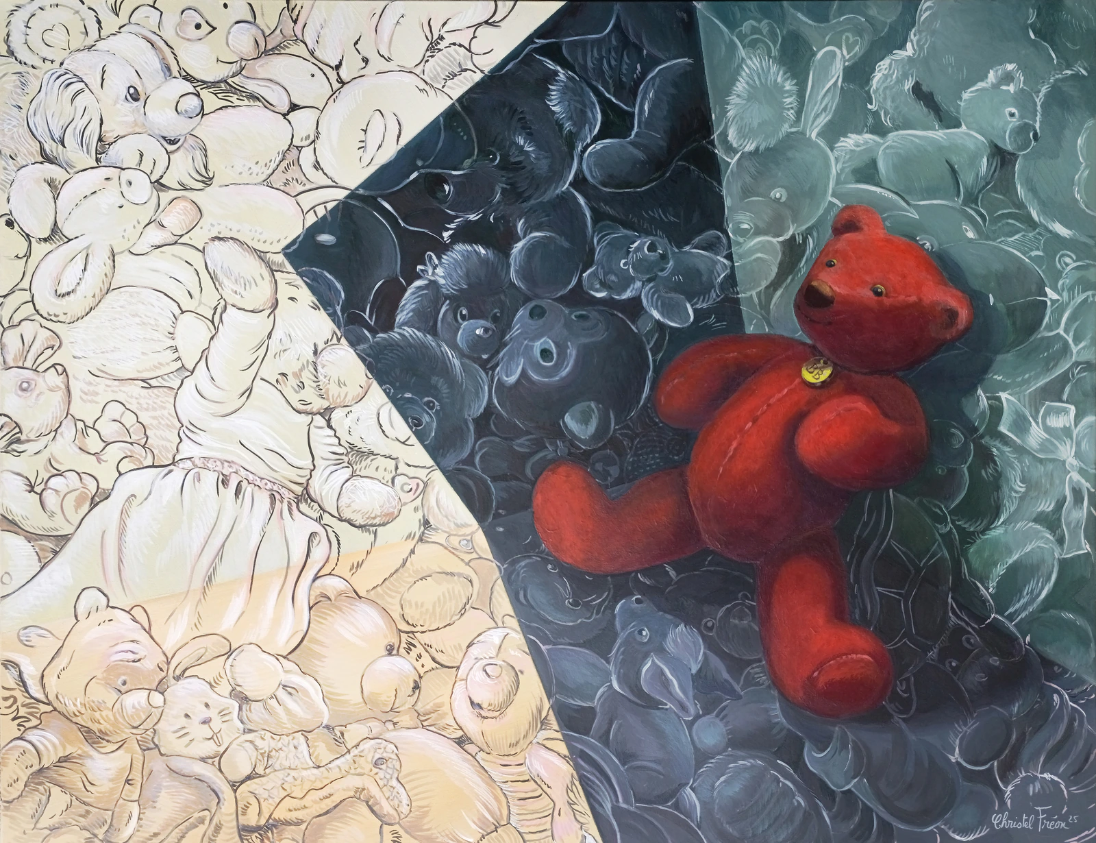Cette peinture met en scène un ours en peluche rouge, assis, qui capte immédiatement le regard. Il se détache avec intensité d'un arrière-plan foisonnant de jouets représentés au trait, symbolisant les souvenirs d'enfance. Le fond est structuré par des diagonales symbolisant un angle ou un coin, révélant une multitude de peluches aux teintes dégradées, allant du blanc lumineux aux nuances de gris-bleu comme tapies dans l'ombre. Le contraste chromatique est saisissant, soulignant la présence singulière de l'ours rouge au sein de cette accumulation. L'œuvre joue sur la densité des formes et la vivacité des couleurs pour créer une composition dynamique et immersive dans un monde de souvenirs.