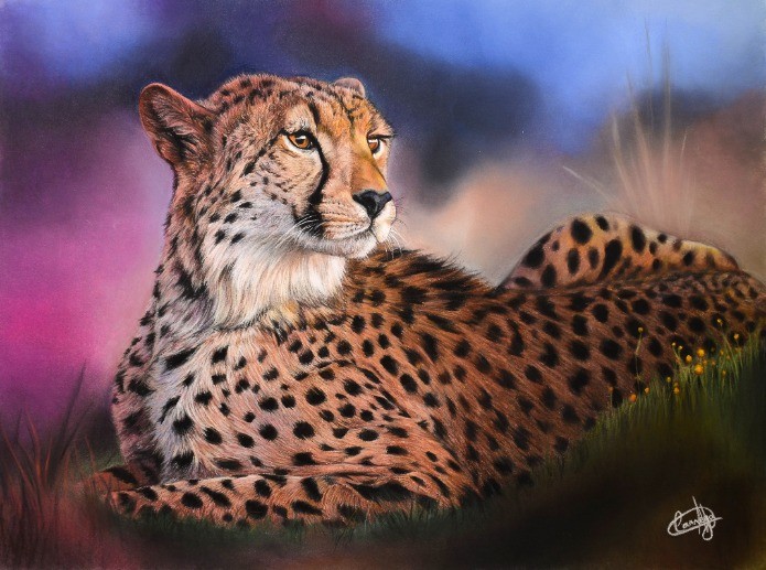 Un guépard au regard brillant et à la fourrure soyeuse que j'ai voulu envelopper d'une lumière crépusculaire aux multiples couleurs .