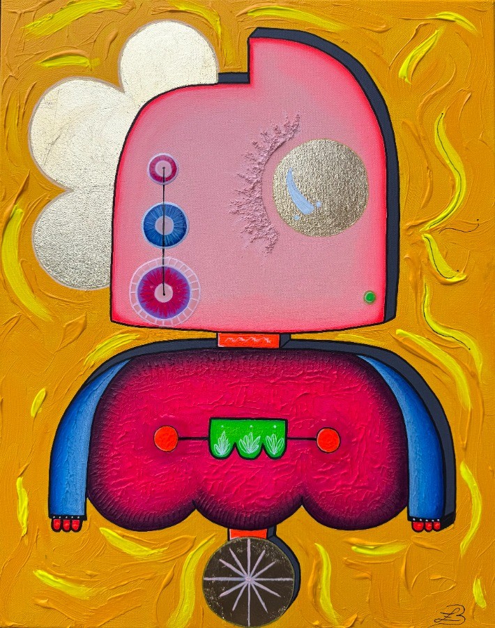 Il recueille la lumière pour la redonner. Ce petit être a un cœur qui bat au rythme de la lumière. Dans ses yeux circule une énergie calme, faite de joie simple et de bienveillance. Chaque matin, il recueille un peu de soleil dans ses cheveux, et le garde précieusement pour en offrir à ceux qui ont perdu un peu d’énergie ou d’espoir. Dans sa boîte verte, il protège la vie. Des plantes y grandissent à l’abri de sa chaleur. Cette toile nous rappelle que la lumière que l’on partage fait pousser la beauté partout autour de soi.