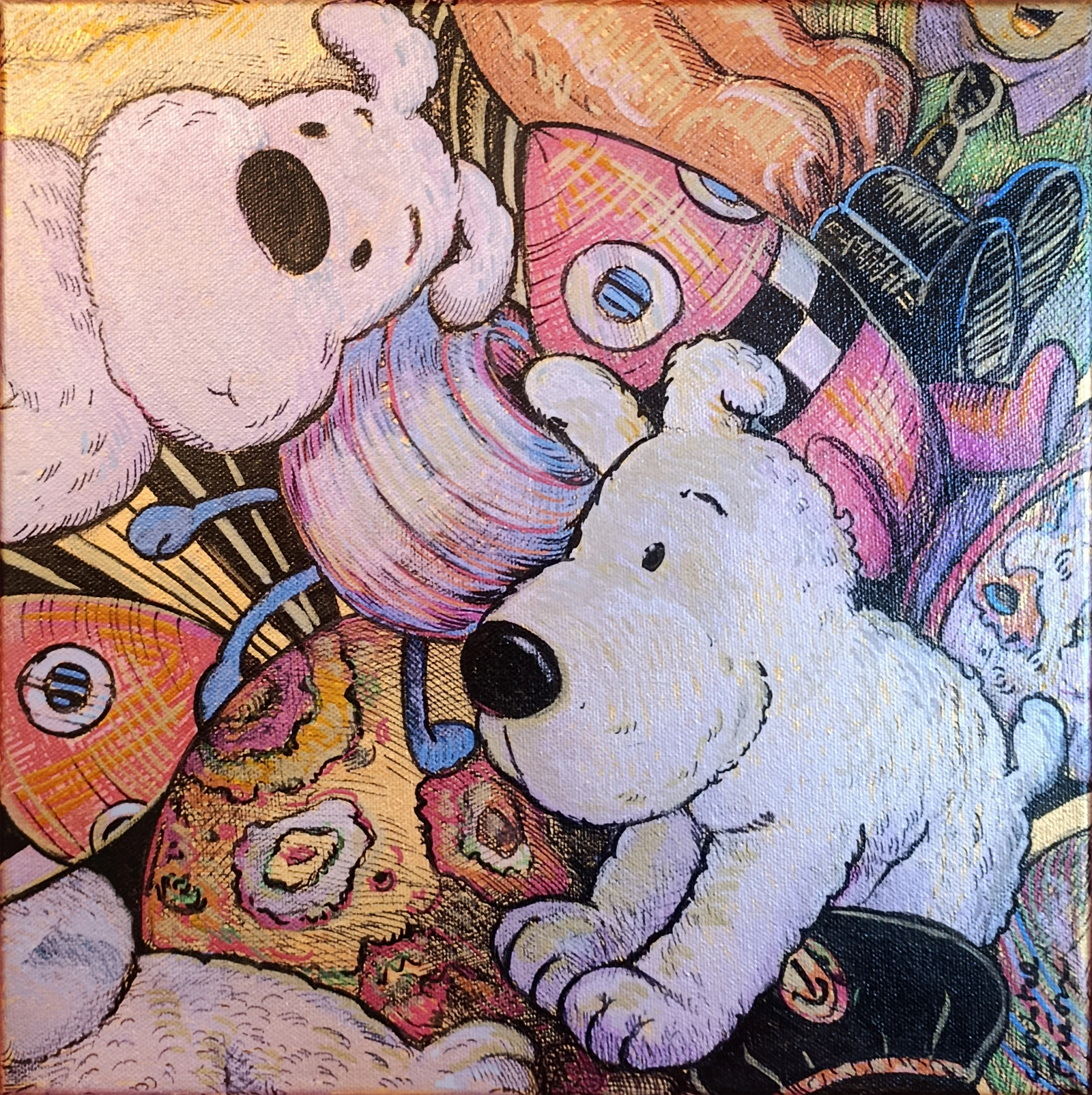 Dans cette œuvre représentant un héros de bande dessinée bien connu, j’ai voulu capter la douceur et la tendresse du rêve à travers la vivacité des couleurs des feutres sur un fond acrylique doré. Les couleurs sont irisées avec de jolis reflets.. Chaque personnage rayonne d’une innocence joyeuse, invitant à la sérénité et à la nostalgie. Cette peinture apportera une énergie apaisante et chaleureuse, idéale pour créer un espace de réconfort chez vous.